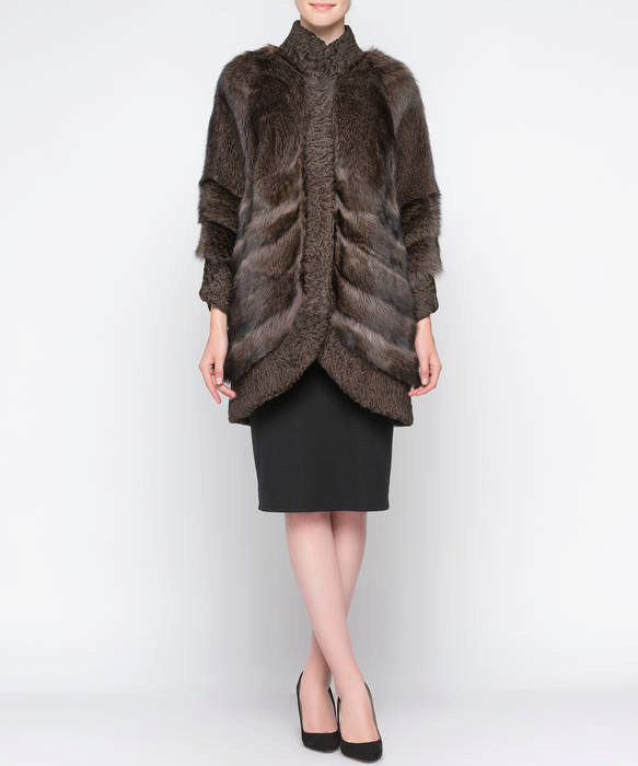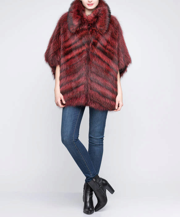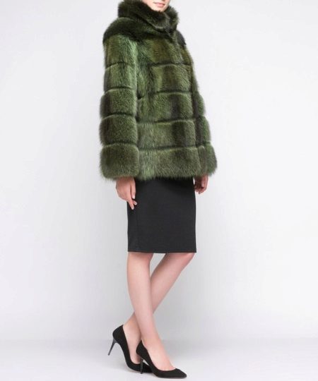 The striking combination of the furry texture of the raccoon fur and a rich green shade looks great on a cross-cut fur coat. Minimalistic black shoes on the heel and matching pencil skirt with the color look both strictly and intriguingly.