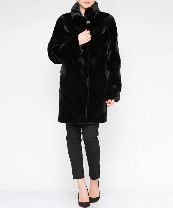 Stylish mink coat, elegant pants and stilettos form the image of total black. The original design solution with alternating diagonal stripes of fur of different texture visually pulls the figure, and a stand-up collar converging at a large decorative button with a brand logo reliably protects the neck from the wind.