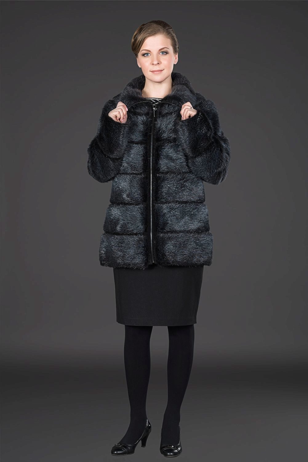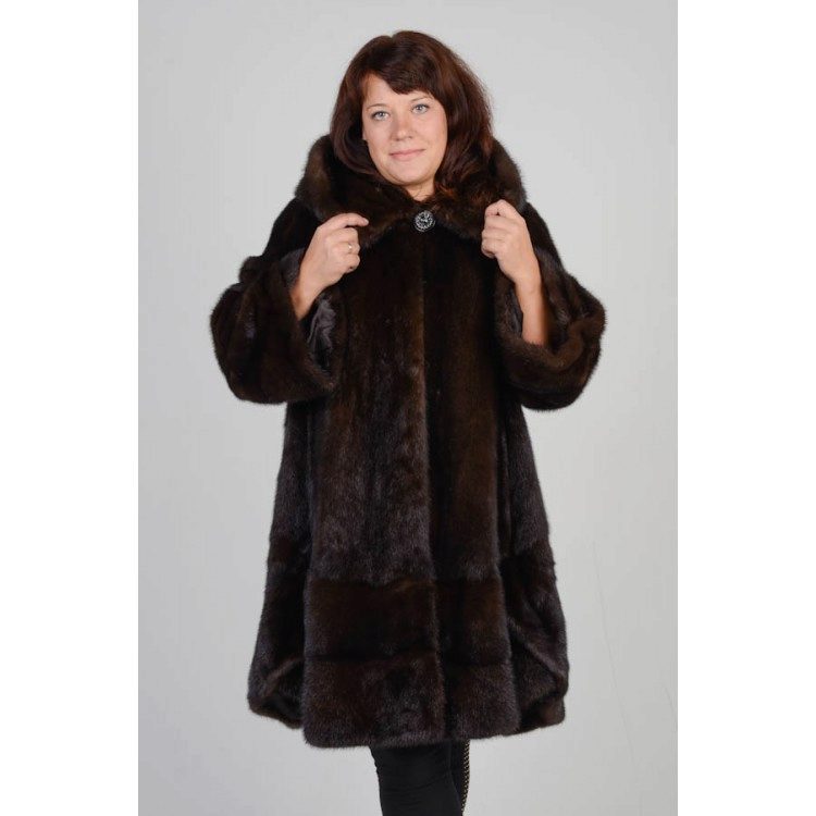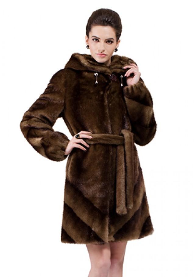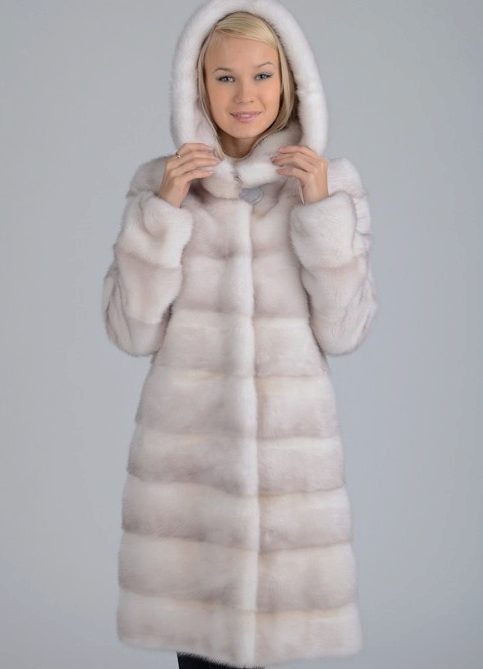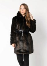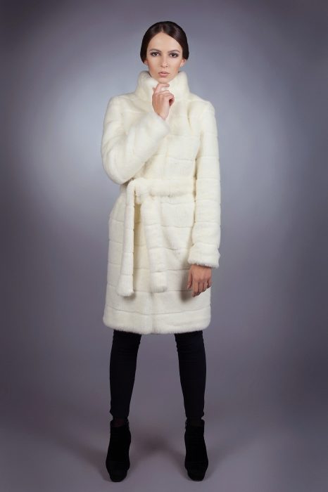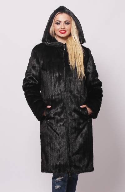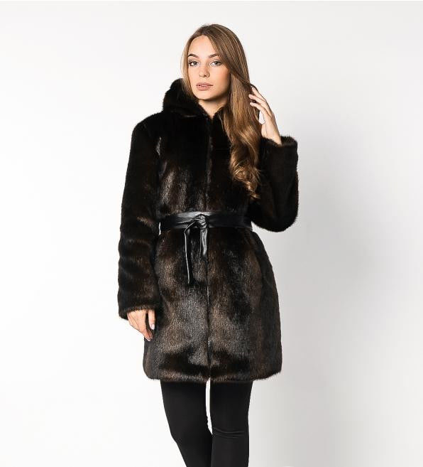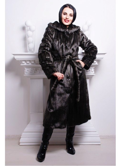 A classic straight-cut fur coat, with an English collar, a voluminous hood and a belt accentuating the waist. This model is perfect for women of high and medium height.