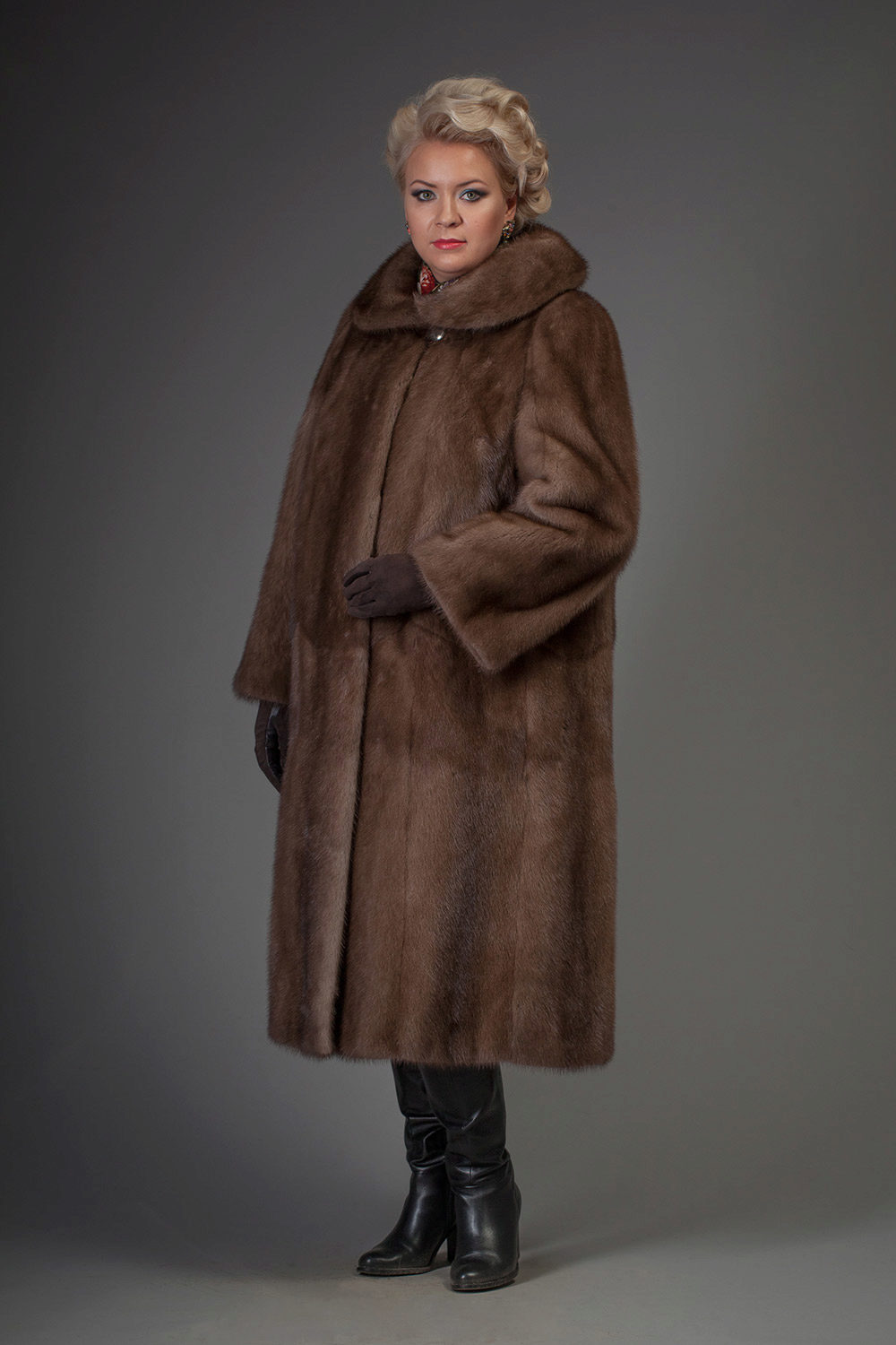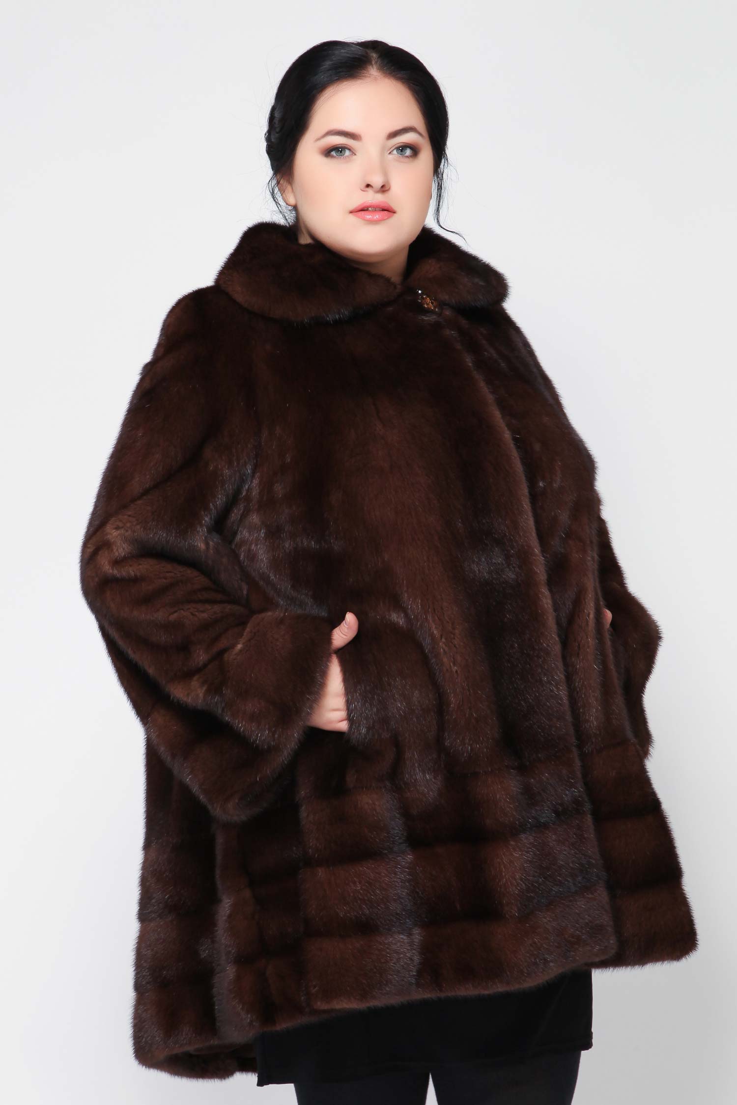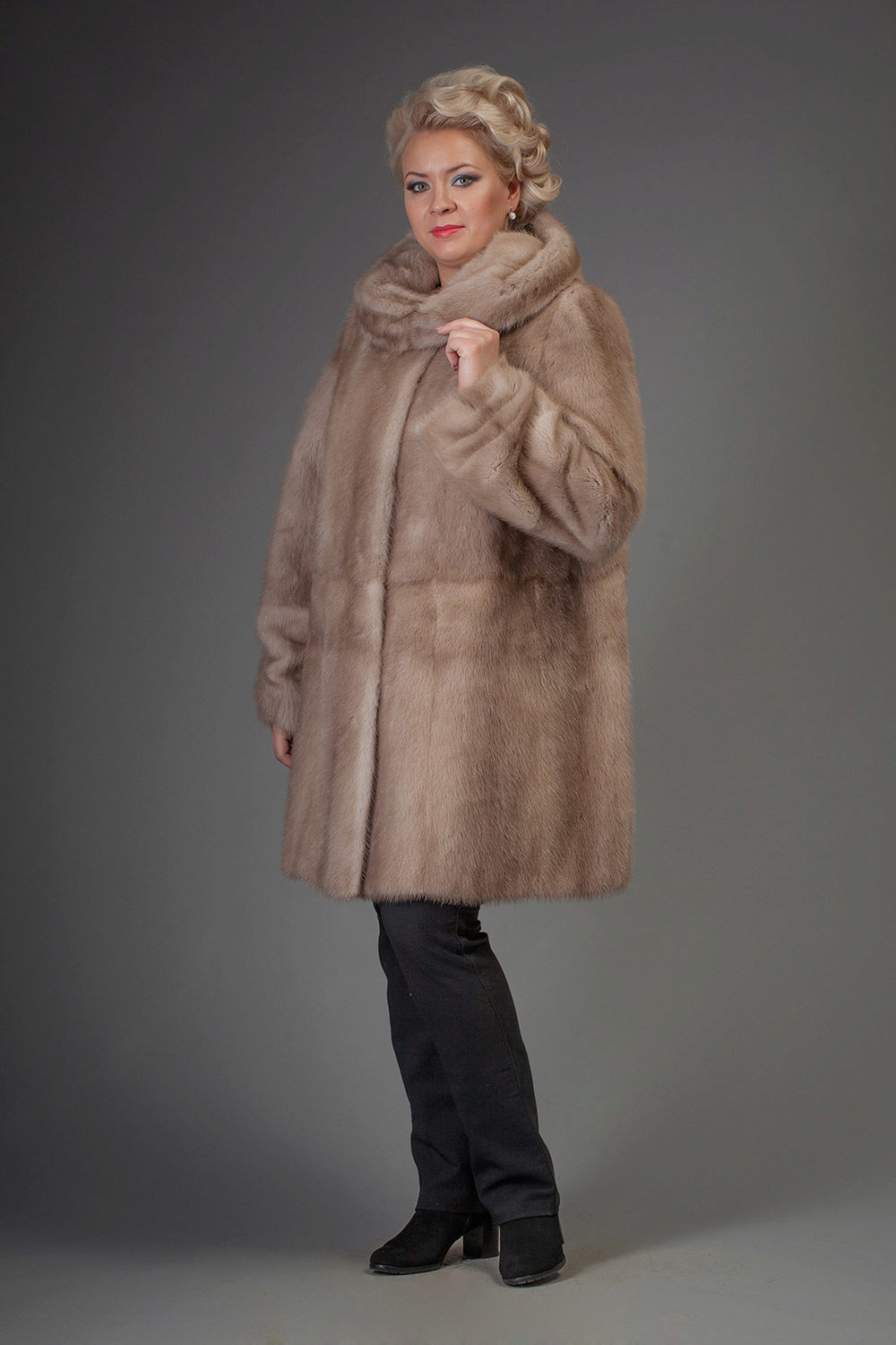 A classic straight-cut fur coat, with an English collar, a voluminous hood and a belt accentuating the waist. This model is perfect for women of high and medium height.