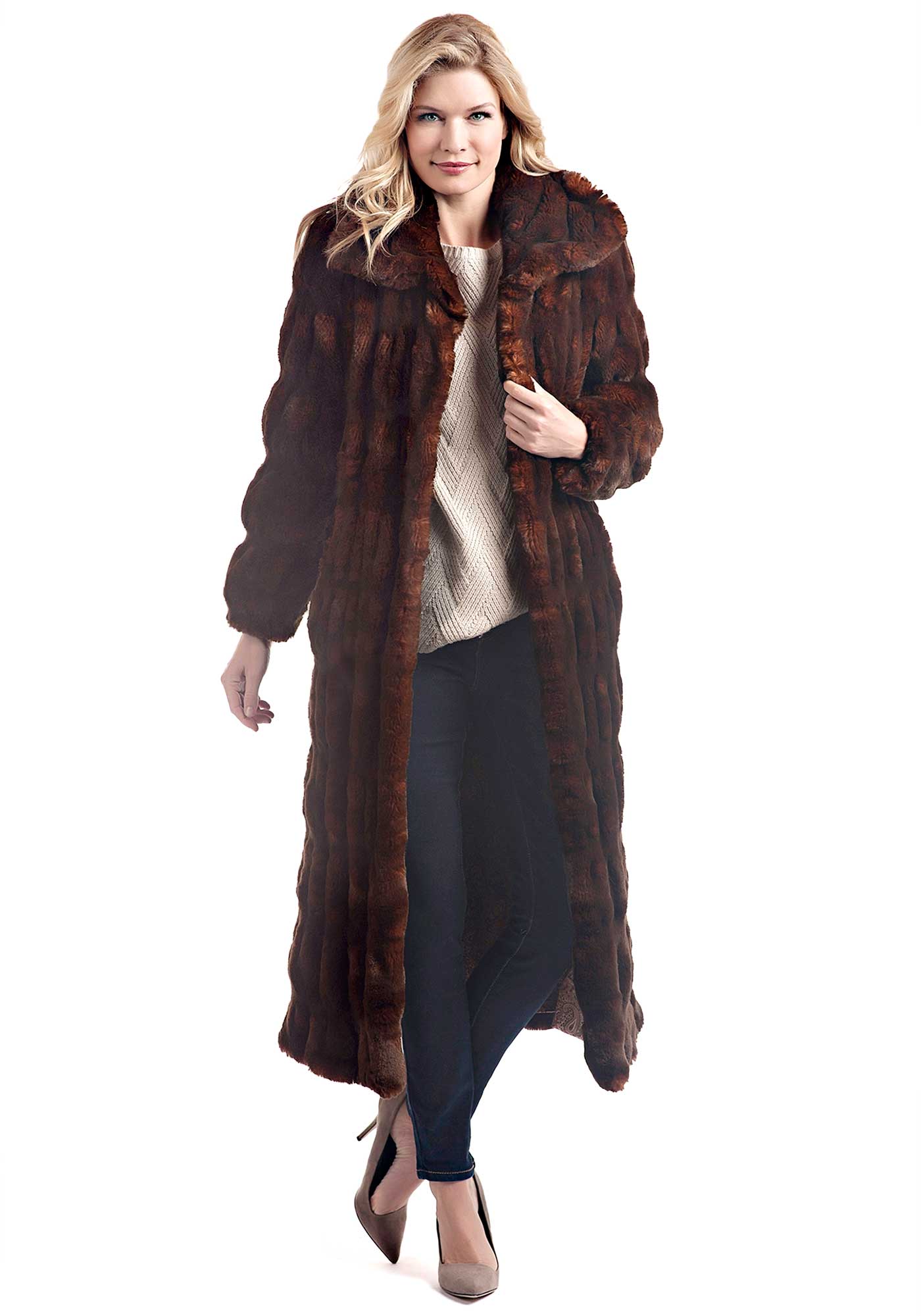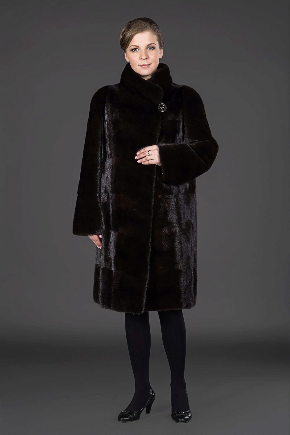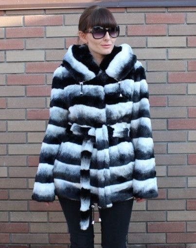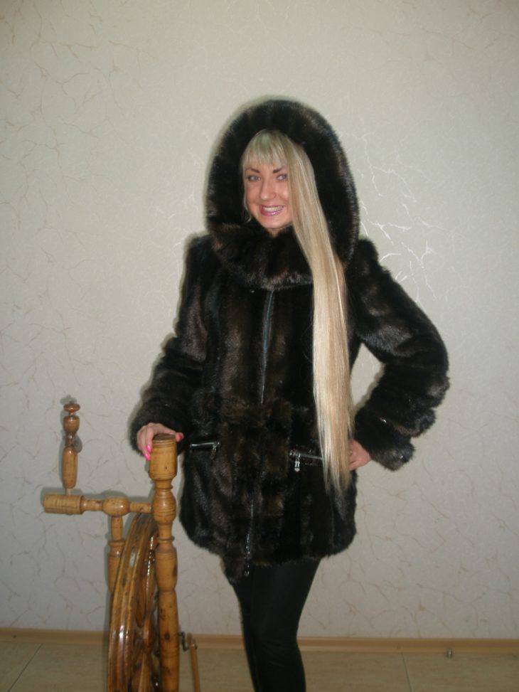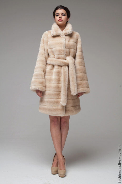 - The product is floor-length, sewn from narrow vertical stripes of fur, with a free cut. The collar is semicircular, turn-down, and the sleeves with small cuffs.
