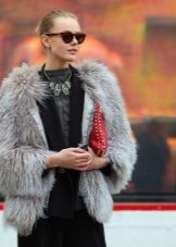 A dark purple short fur coat with a high pile and a large hood looks great with a turtleneck and dark jeans. As an accessory - a small black bag of embossed leather on a long chain.