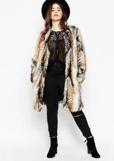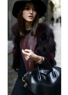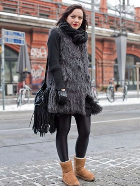Another fashionable version of a fur coat without sleeves - this time everyday. Black shiny leggings, a scarf-snud, tan uggs, a black bag with a fringe and short gloves - a real fusion.