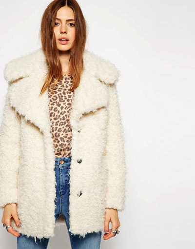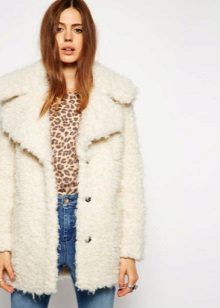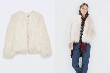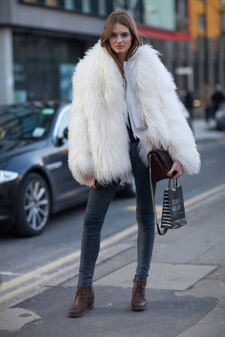 Real casual chic from “Zara” is a big snow-white fur coat with a very long nap, aqua skinny jeans, a white blouse and brown boots. The image is perfectly complemented by a brown handbag with a chain.
