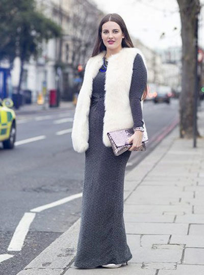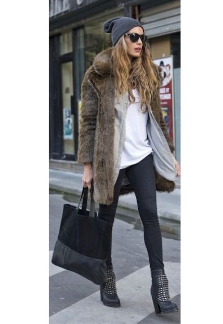Another good street look is a “rabbit-like” fur coat, black leggings, a white T-shirt, a gray slim cardigan, a toe cap, and tall black booties with numerous rivets. The finishing touches are a rectangular black bag of two types of fabric with short handles and sunglasses.