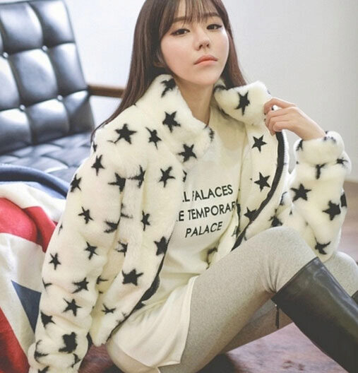 Doll glamor - a short coat of a milky color with a star print, a t-shirt, gray leggings and leather knee-high boots.