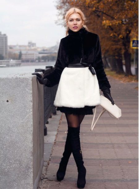 A very elegant short two-tone fur coat with a detachable and flared skirt on a belt of ribbon, suede high boots and a white handbag will make your look unique and attract the desired attention to you.