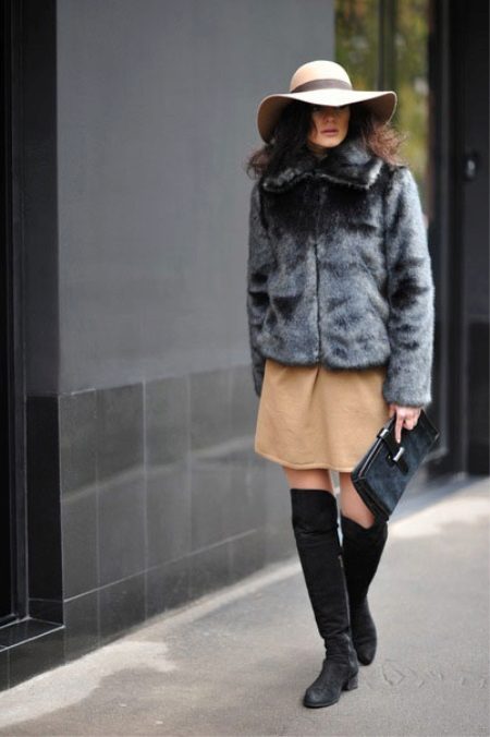 A short gray fur coat “under the mink” is perfectly combined with a beige dress, boots-boots and a wonderful wide-brimmed hat of light sand color with a wide brown ribbon. Suede black clutch bag adds a touch of style to the look.