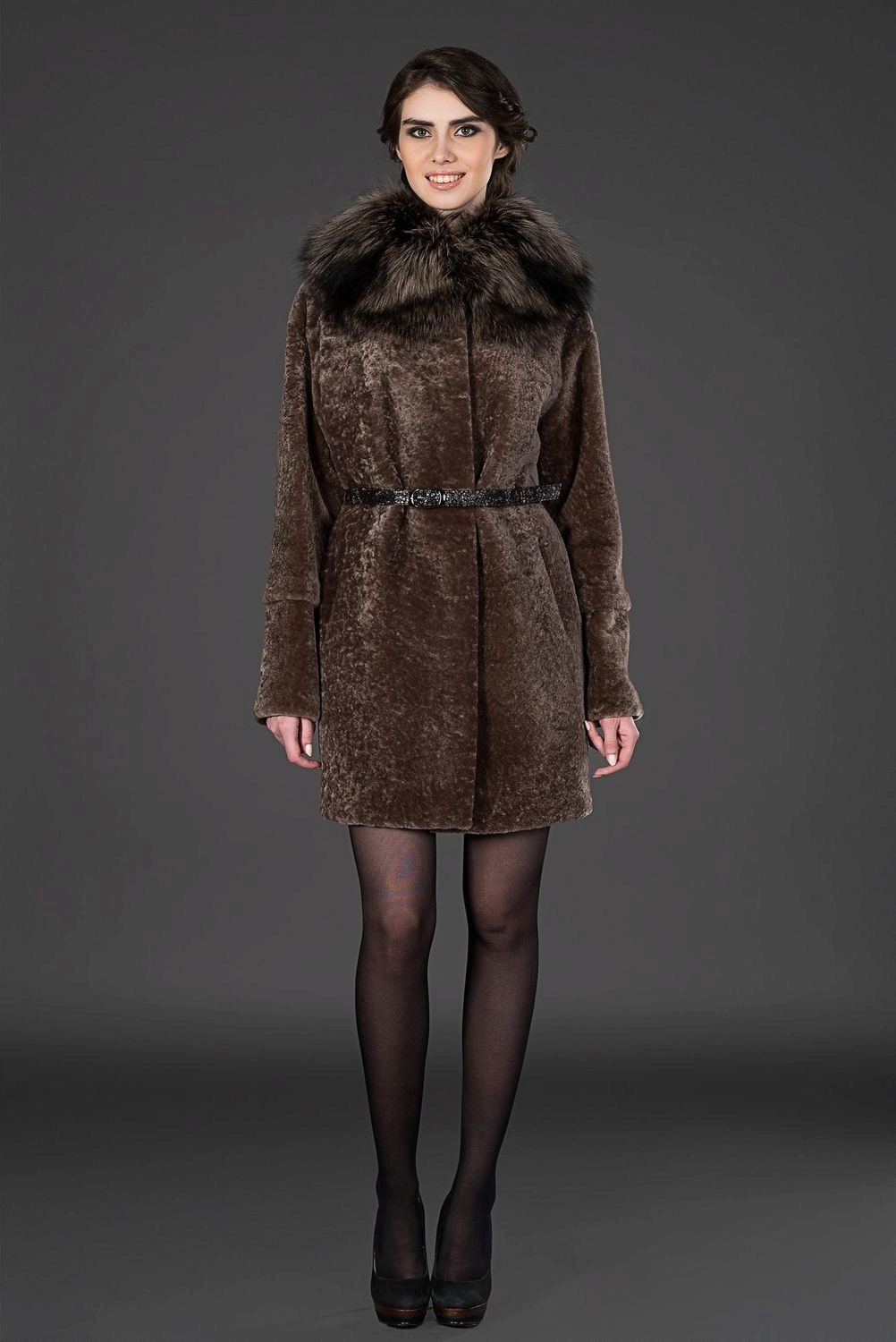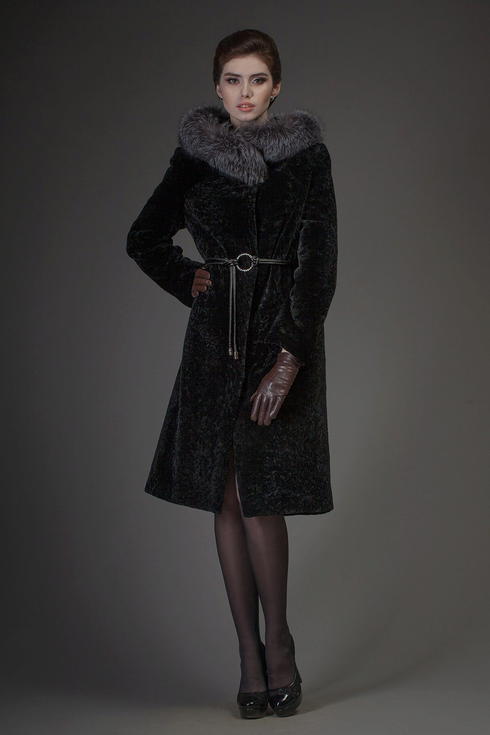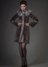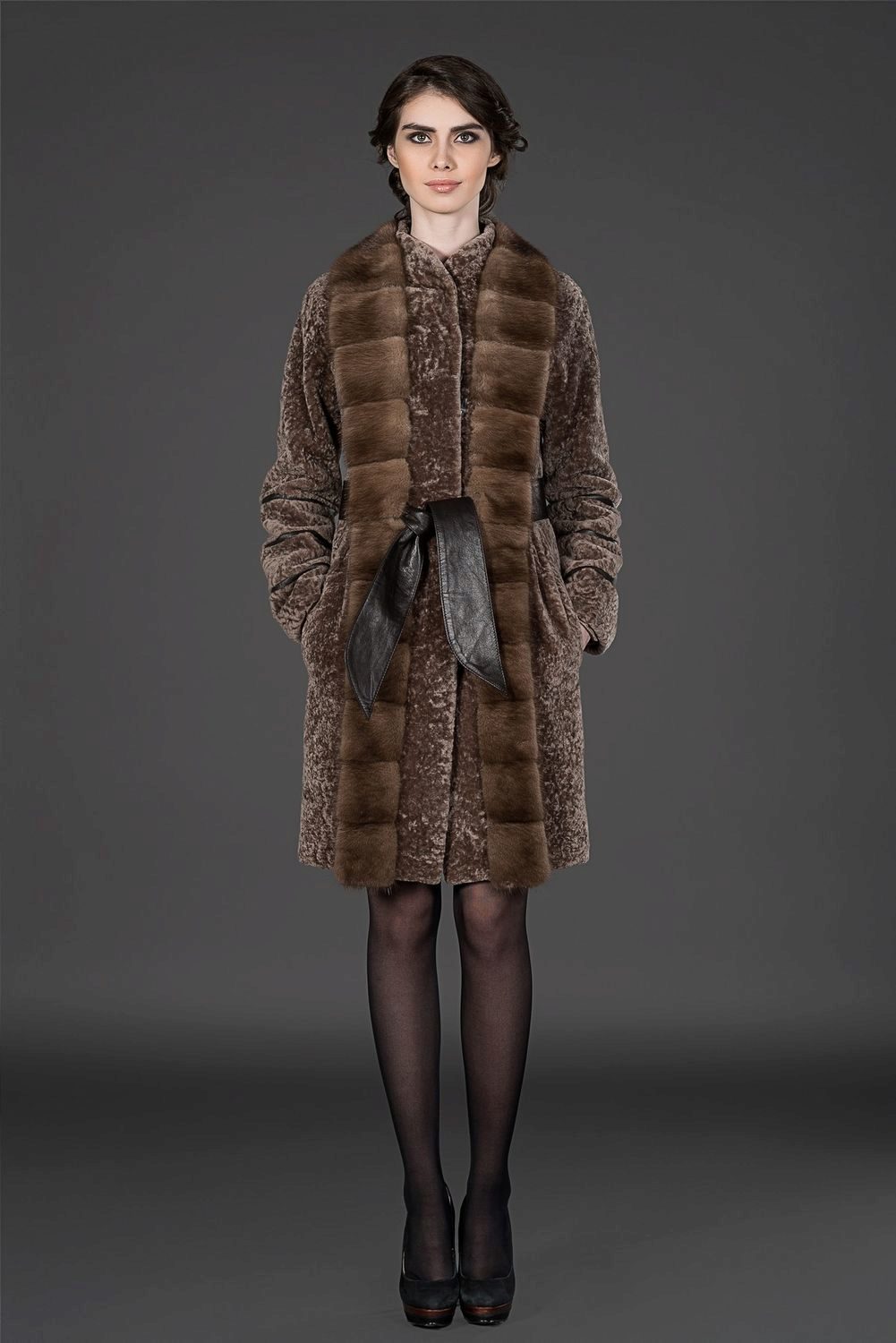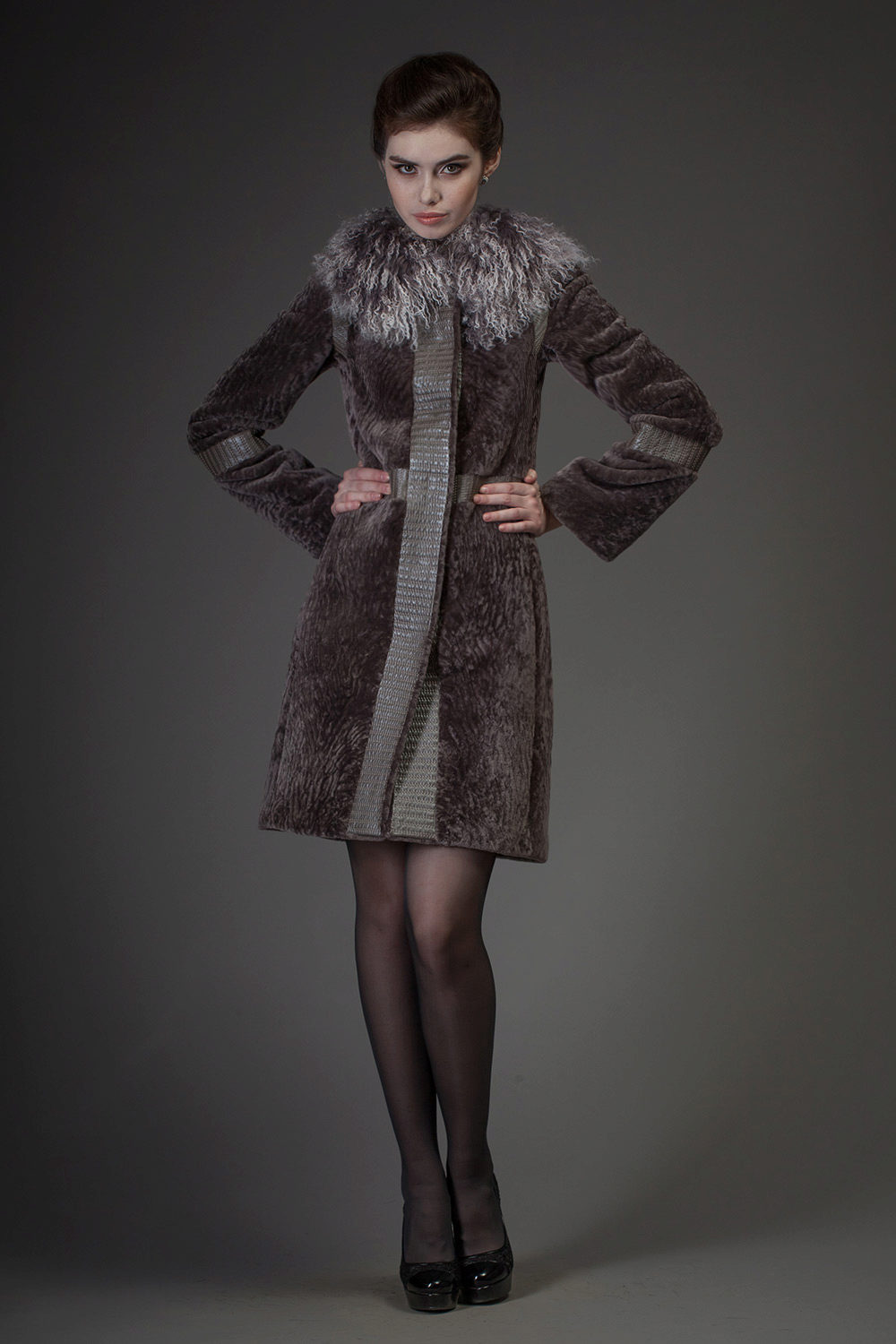 - Astragan fur coat is accentuated by a goat fur trim on the side cuffs, cuffs and collar. The dark gray color of the fur coat emphasizes and brightens the finish of the steel-goat fur. A straight-cut mid-thigh fur coat with a long sleeve and a black leather belt is incredibly slim and adds height. The neat pockets give neat pockets - chest chest and two side - with a black leather edging. High cuffs and a shawl stand-up collar make this model memorable and unusual.