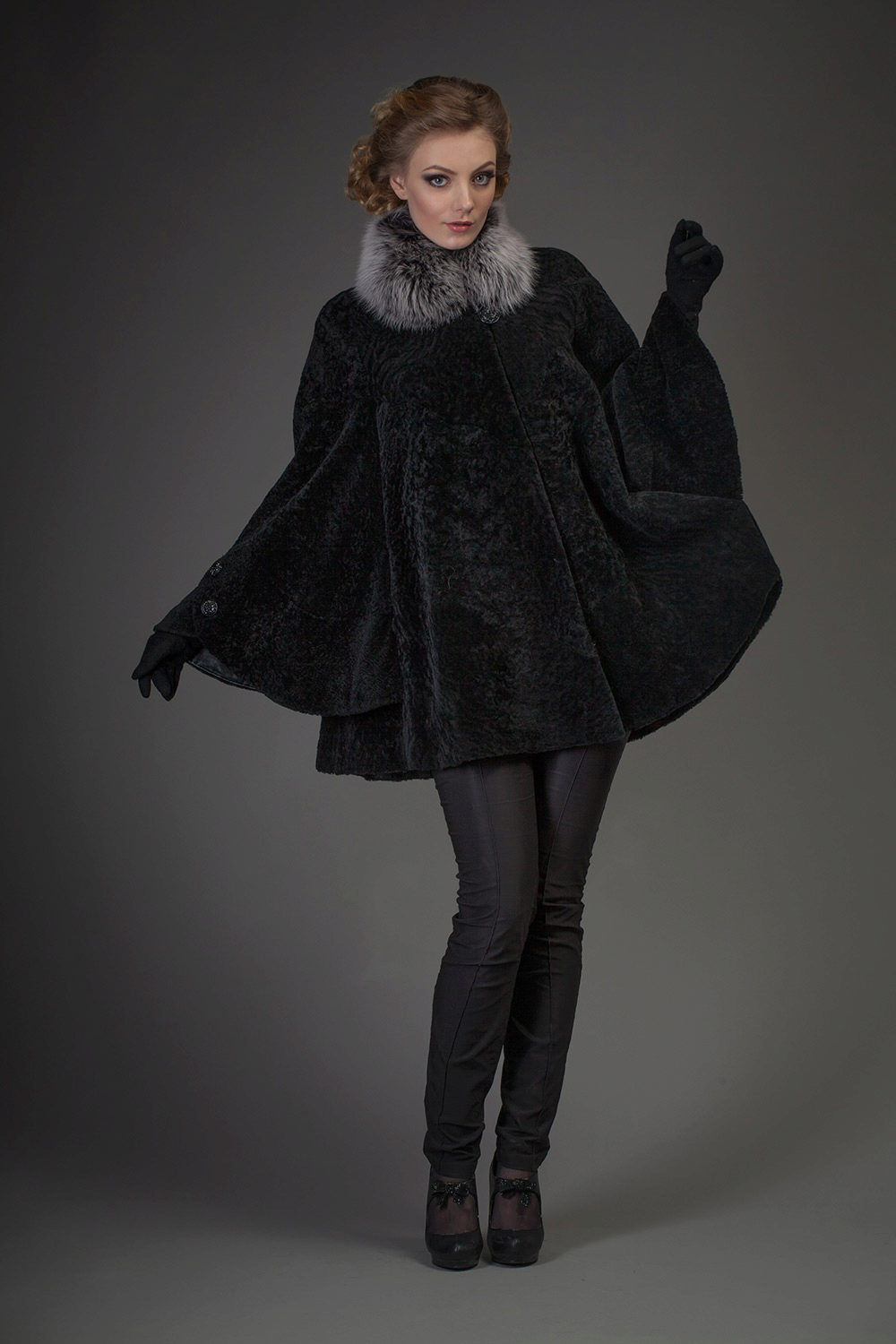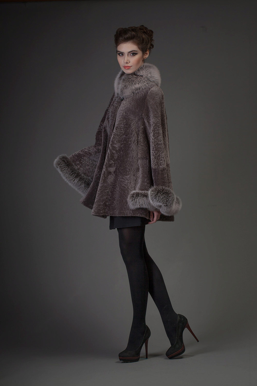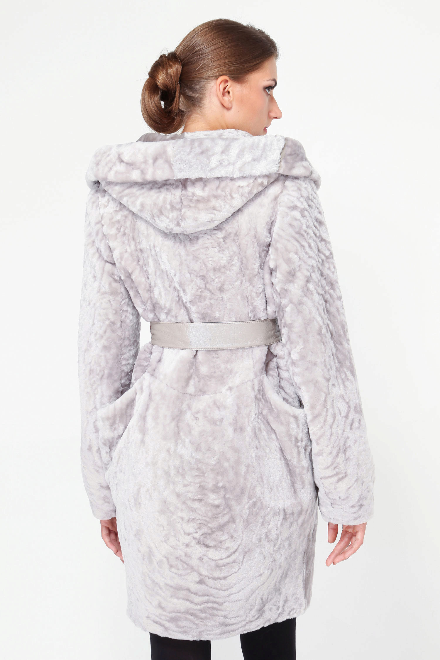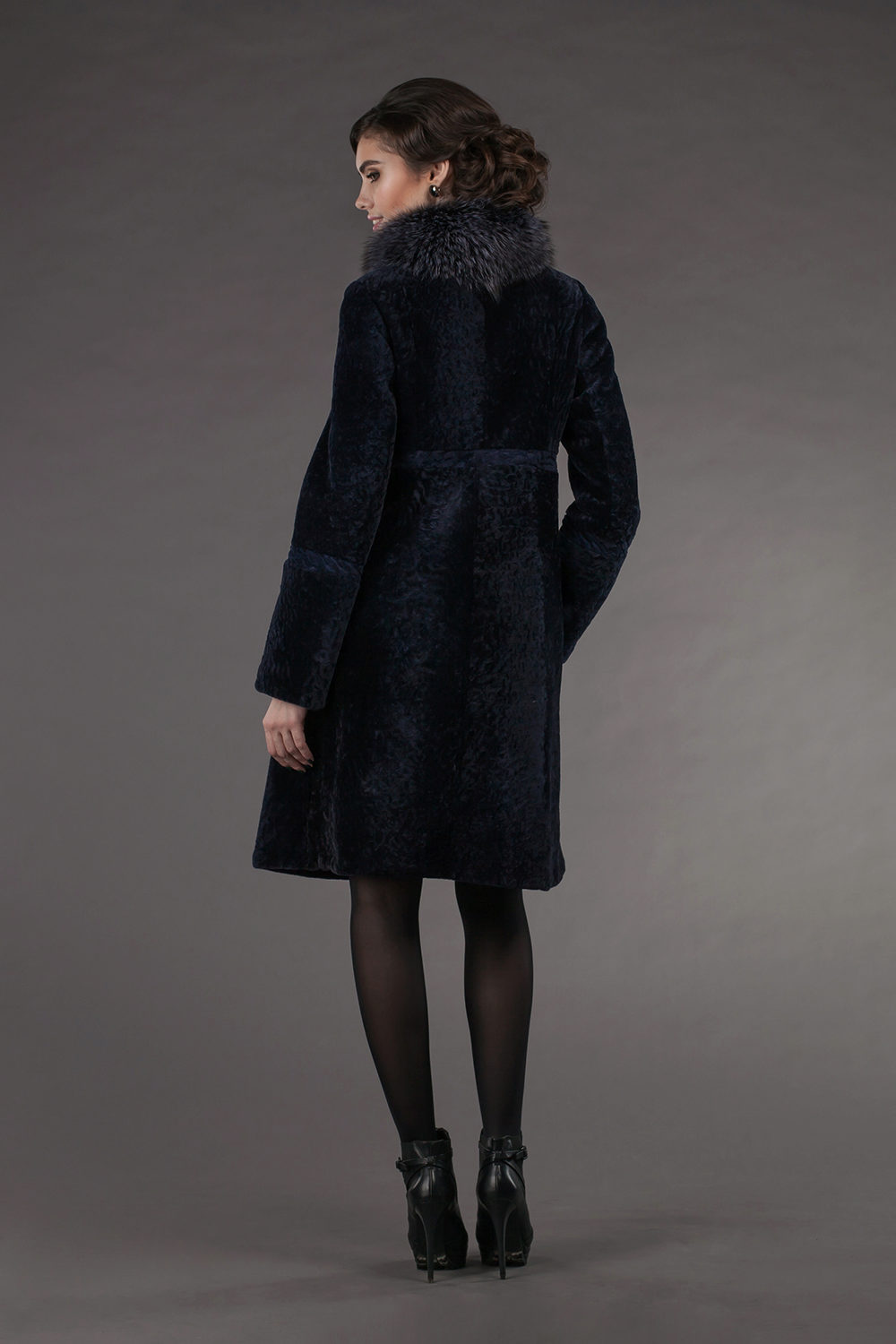 - Astragan fur coat is accentuated by a goat fur trim on the side cuffs, cuffs and collar. The dark gray color of the fur coat emphasizes and brightens the finish of the steel-goat fur. A straight-cut mid-thigh fur coat with a long sleeve and a black leather belt is incredibly slim and adds height. The neat pockets give neat pockets - chest chest and two side - with a black leather edging. High cuffs and a shawl stand-up collar make this model memorable and unusual.