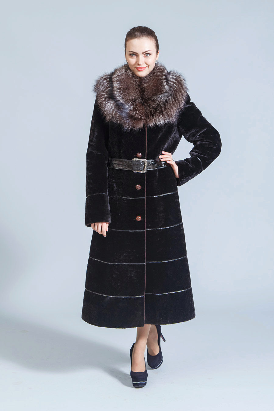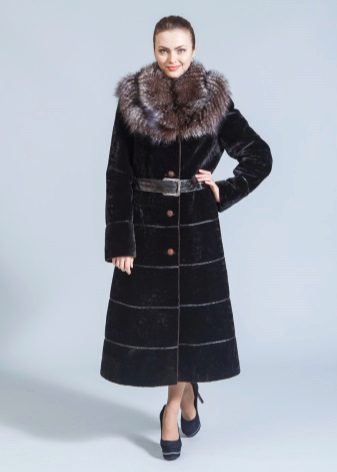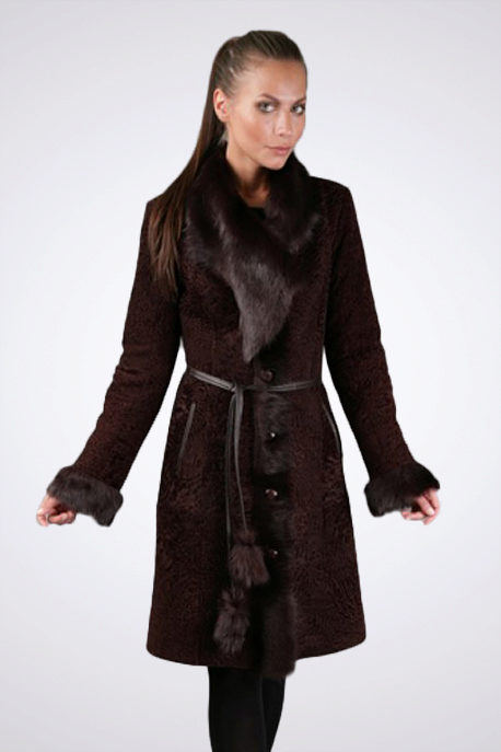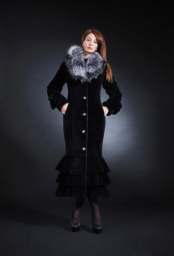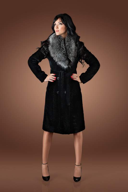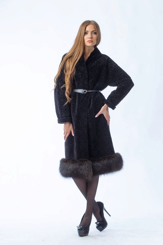 - The classic model of black astragana fur coat is effectively complemented by the trim of the hem with black-brown fox fur. The length of the fur coat is below the knees, the fitted silhouette, the original leather strap, the sleeve with cuffs cuffs and the shawl collar will make any woman elegant and fashionable at the same time. Fur fox favorably emphasizes the slimness of the legs, to become and gives the image chic and consistency.