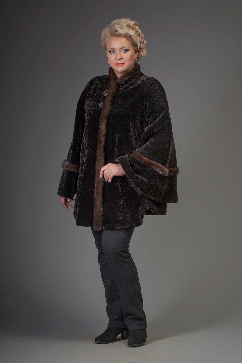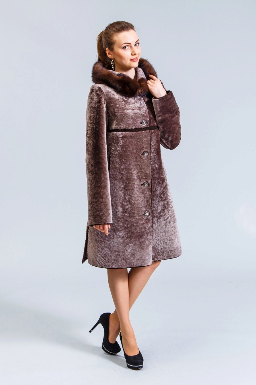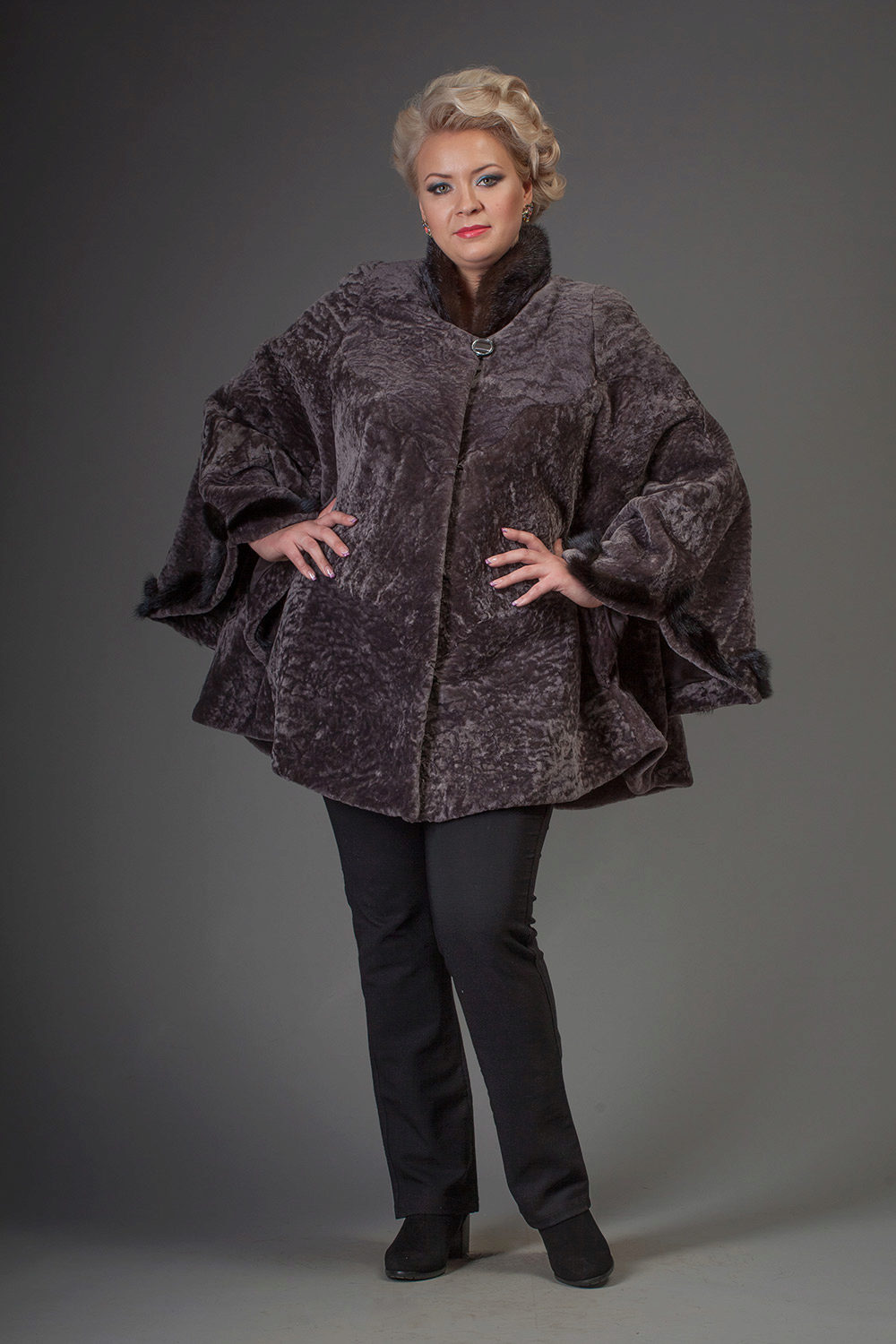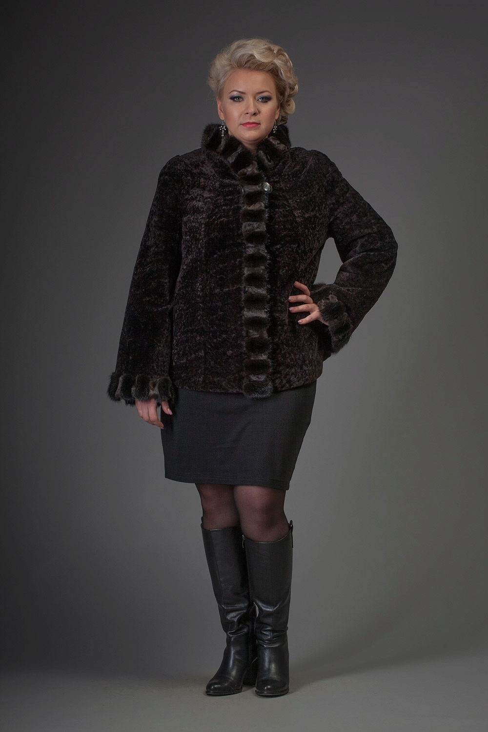 Astragan allows you to look feminine and slim to any girl. For women with curvaceous shapes, a properly selected model allows you to hide some figure flaws and excess weight, since the astragun’s nap is short and does not visually weigh down the image.
