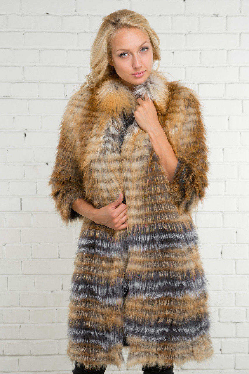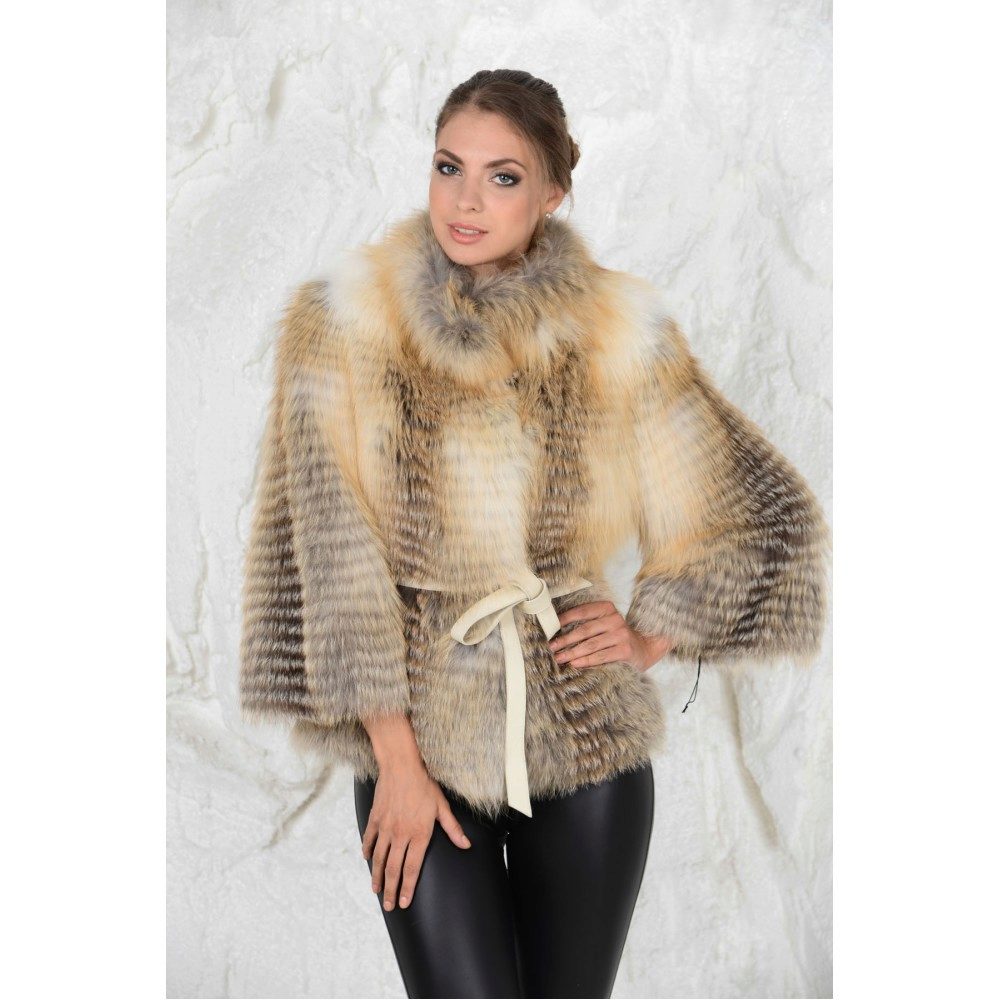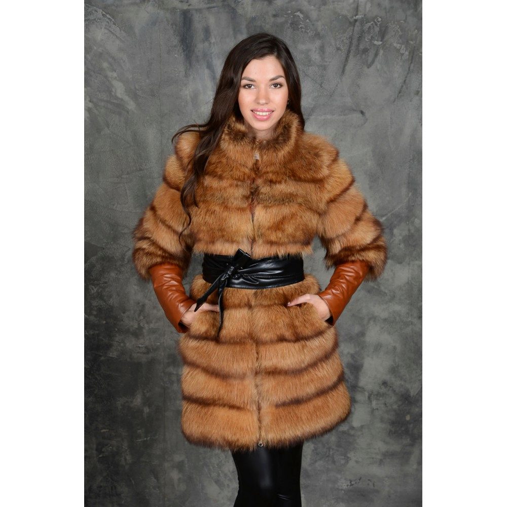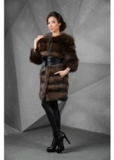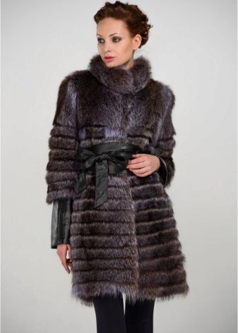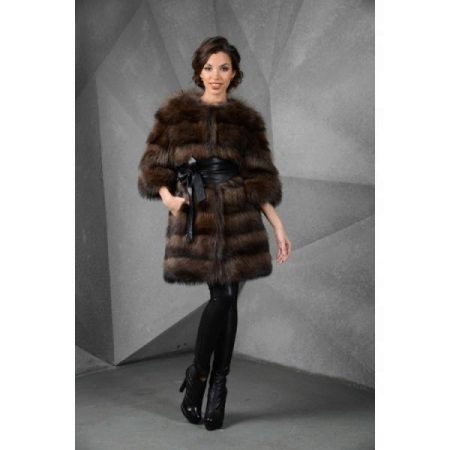 - A very feminine version of a coat of raccoon with a neckline in the style of "Chanel", a length above the knee, semifitted silhouette with a wide leather belt. The fur coat is sewn crosswise, the length of the sleeve is кожаный, the leather belt is two turns long and tied with a spectacular bow. The color transition from golden red to dark brown gives a special charm and ultrafashionable.