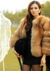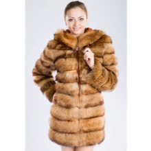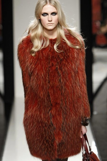 - Stylish coat of raccoon deliberately simple straight cut, with long sleeves and without a collar, with a round neckline. The impression is the color of the fur coat, which is the "highlight" of this model. The bright red primary color, enhanced by the red and dark hairs of the pile, gives the fur coat the appearance that it is made of beautiful bird plumage. Ideal option "and in a feast, and in the world", as they say.