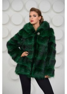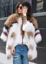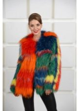 - Incredibly glamorous coat of raccoon will suit young and extraordinary girls, creative and active. In addition to combining the fur of a raccoon with another shorter one, in this model the main place is occupied by the different colors of the fur coat details - stripes and triangular wedges - beige, red, smoky, blue and green. Long awnings of pile are toned in dark color, which adds spice and emphasizes the brightness of the dress. Coat length to mid-thigh, long sleeve with a transverse effect, neck without a gate in the style of "Chanel". Such a fur coat will make the image memorable and bright.