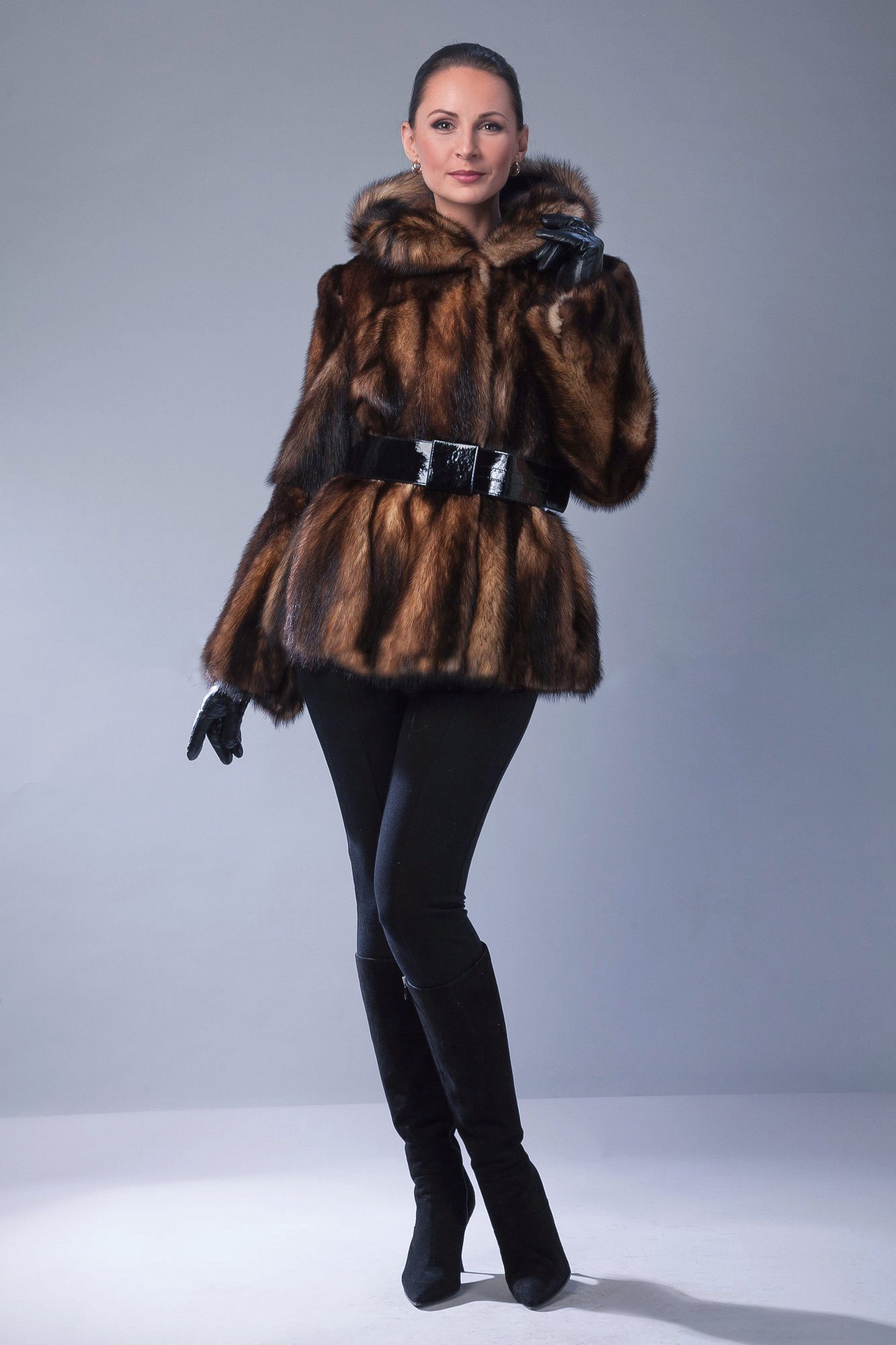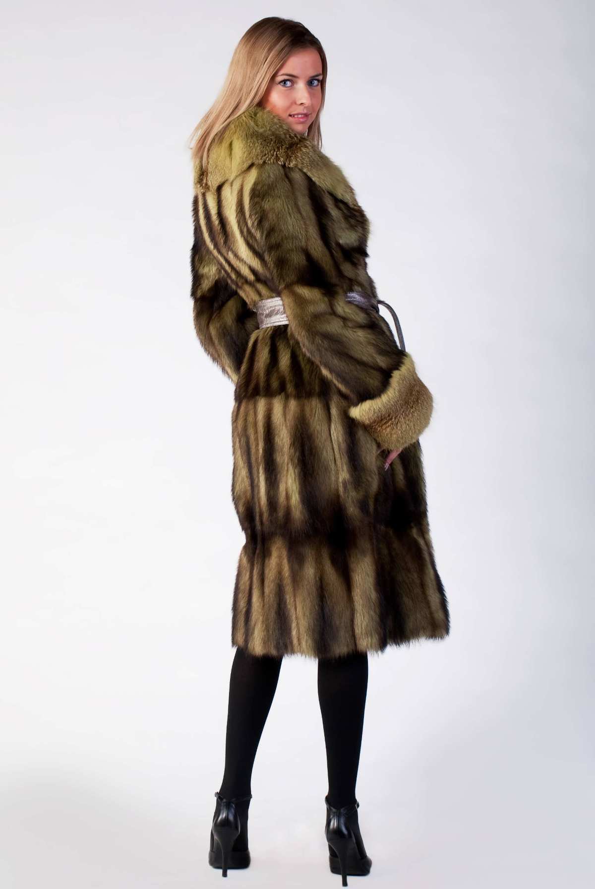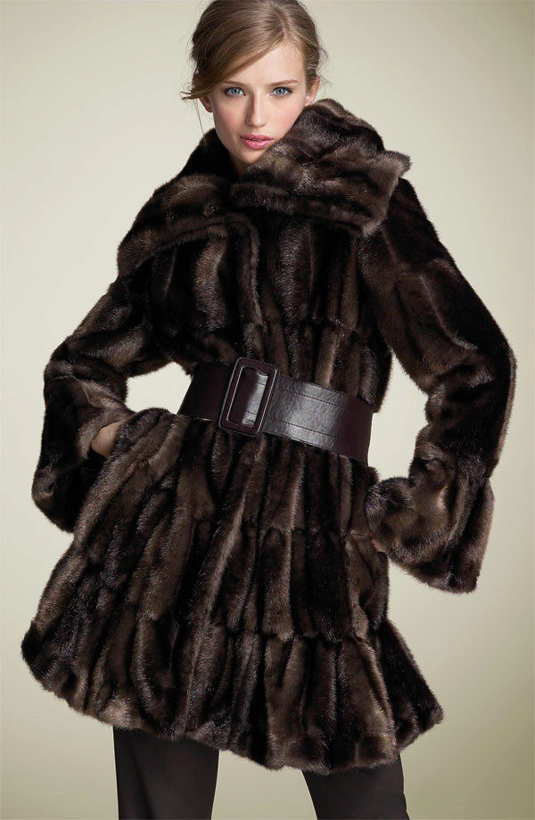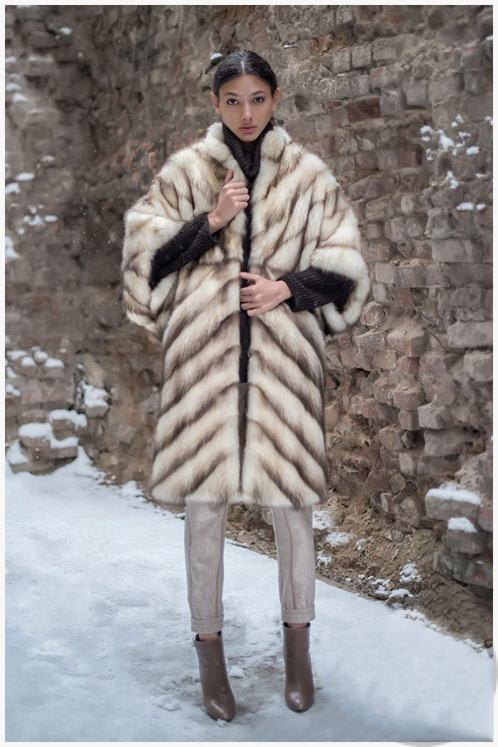 Of the long styles, the swinger or the mantle is still popular. It is a fur coat about a meter long with a free sleeve, sewn in the shape of a trapezium and often equipped with a fur belt.