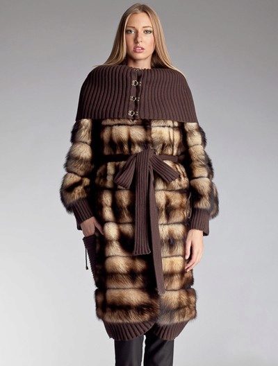 The ferret’s fur blends in well with knitwear, as a rule, these are sleeves, elastic bands at the bottom of jackets, cuffs or shale collars. There are models in which the ferret occupies less than half the product area, that is, the polecats are just used for finishing leather, knitted or textile outerwear items.