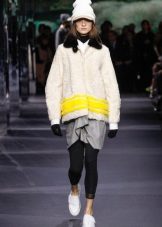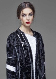 - A gentle white coat from white Swakara is perfect for confident and elegant women. Straight, classic cut, three-quarter sleeves, a round neckline without a collar, large patch pockets of a clear geometric shape - all this adds to the brevity and severity of lines. The length just below the knees effectively pulls the silhouette.This option, complemented by a light dress and contrasting black shoes, is suitable for publishing, theater, business meetings.