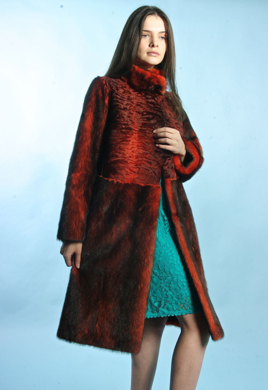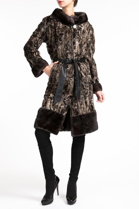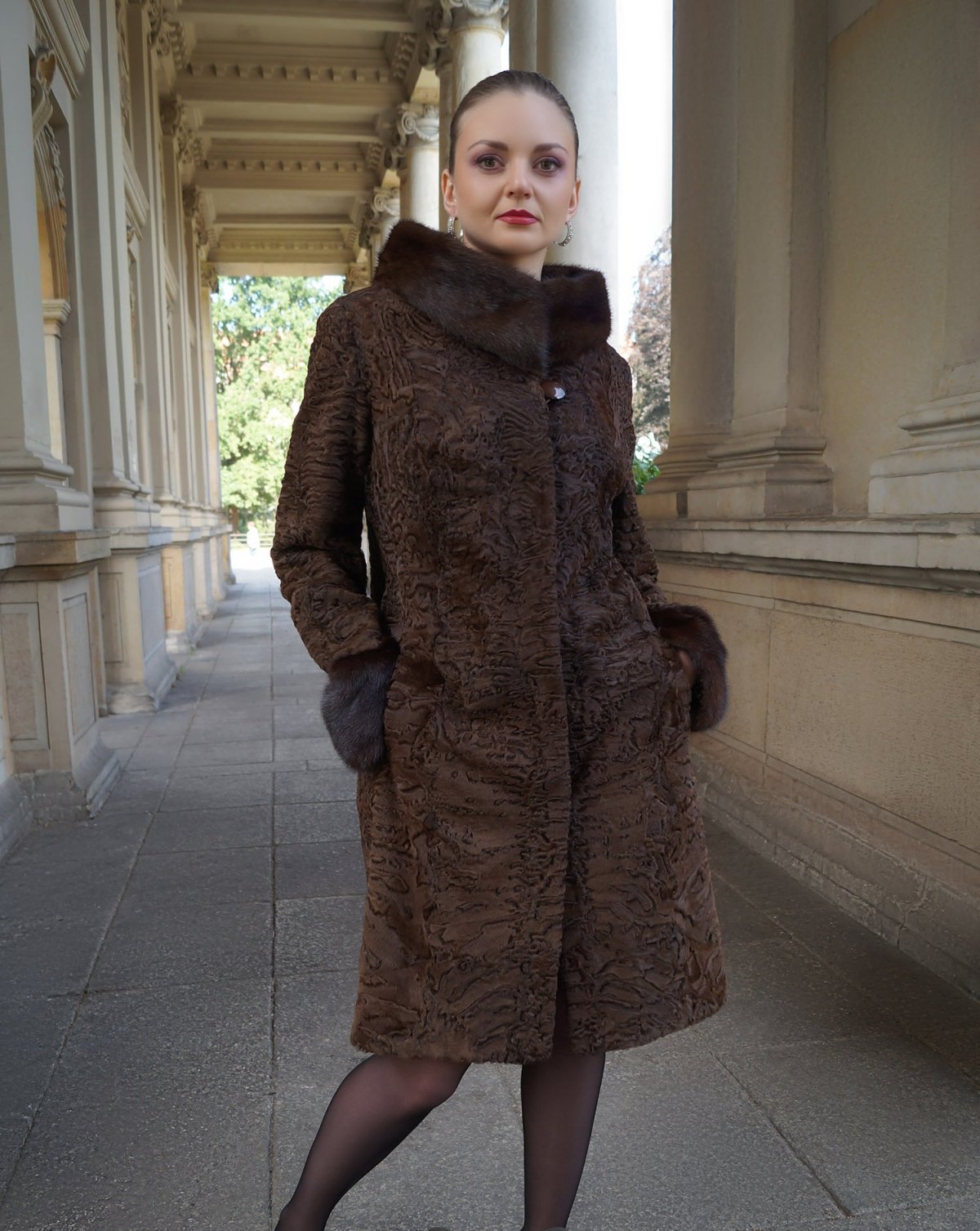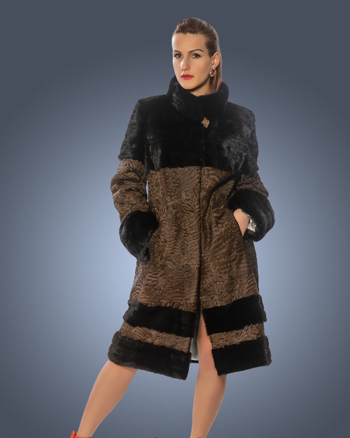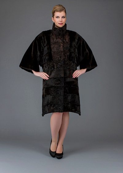 - The original model of a fur coat made of astrakhan chocolate color in combination with mink fur of the same color creates a unique look. The model of a direct free cut, with a stand-up collar and wide sleeves –pipes perfectly will be suitable for women with magnificent forms. The length of the fur coat to the knees will favorably emphasize the slimness of the legs and stretch the silhouette. The hem of a fur coat is as if stretched along the edges, which gives originality. The highlight of this model is the combination of astrakhan and mink - the back, part of the front shelf at the sleeves, fur coat sleeves. In this case, the sleeves go to the front shelves. The visual effect of a mink cape is created. Sleeve Length ¾.