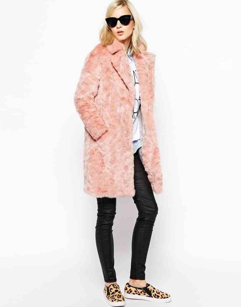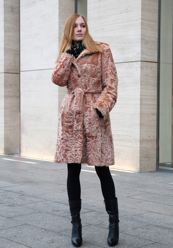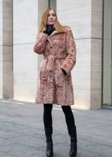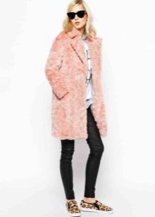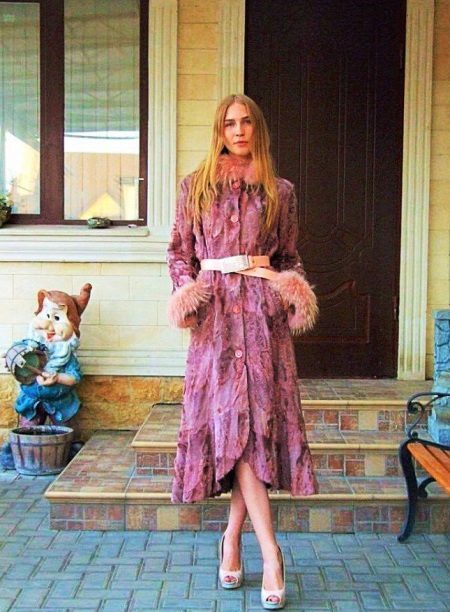 Another self-sufficient option - a long coat of goat, dyed in an unusual pink color with raccoon trim. This fur coat can be safely worn with a short skirt or dress. A beige belt and heeled shoes will complete the look.
