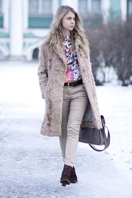 The fur coat of medium length, beige, not only looks soft and new, but allows you to wear light things under yourself. Silk shirt with a bright floral print tucked under beige narrow pants. Bright emphasis is also placed on plum-colored shoes. The bag is best to match the tone of the fur coat.