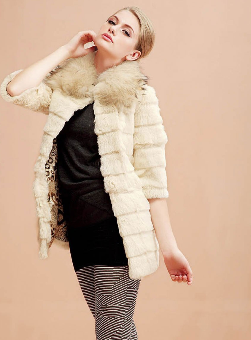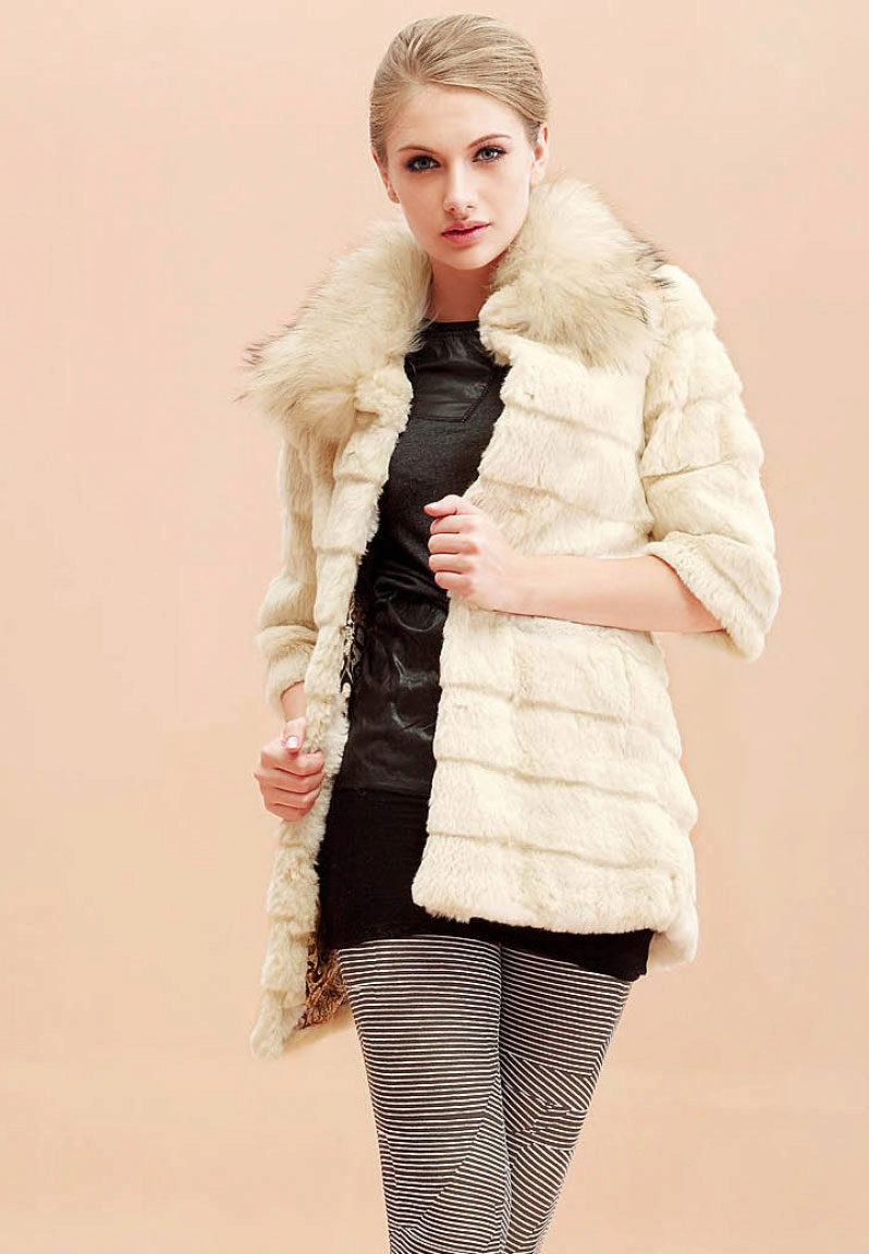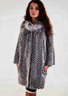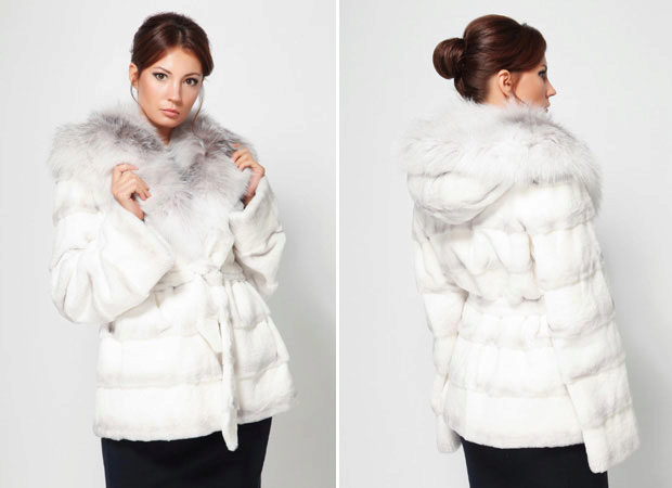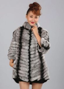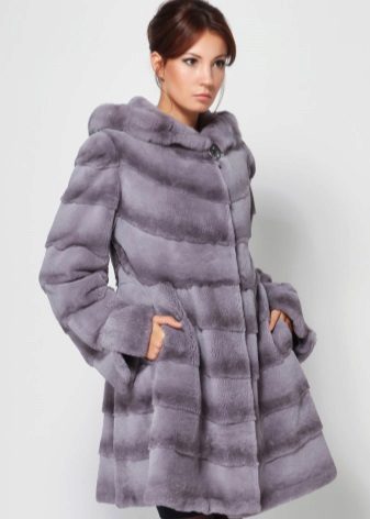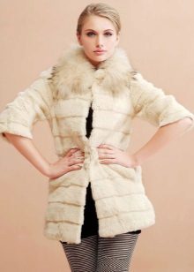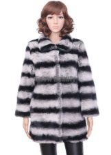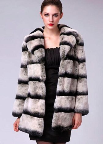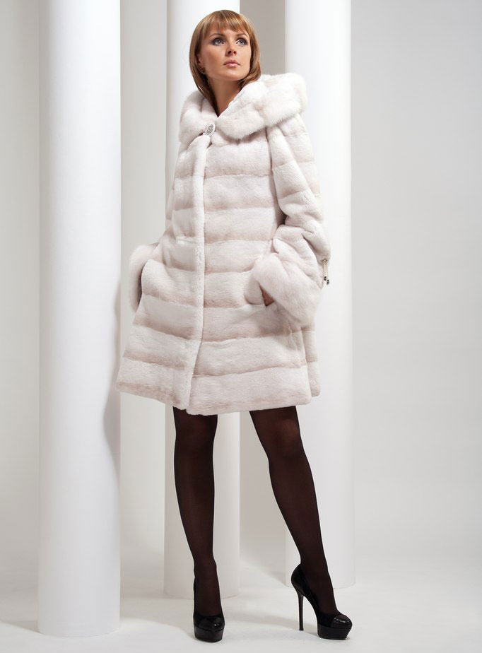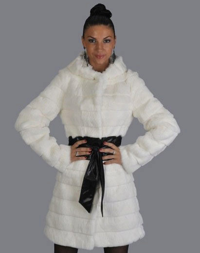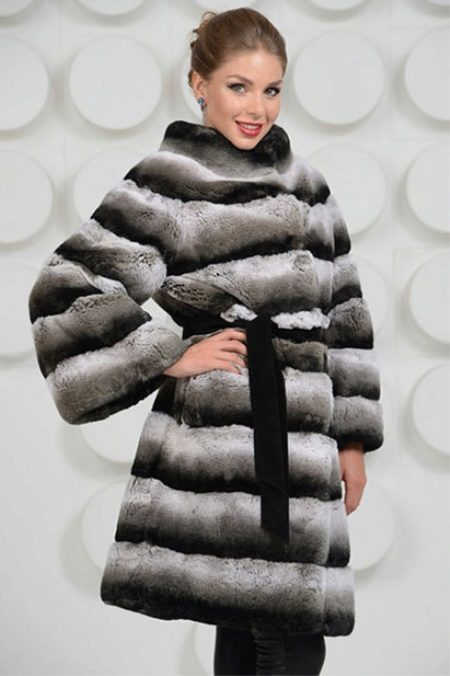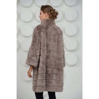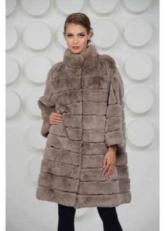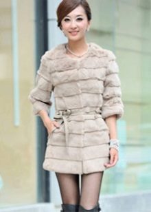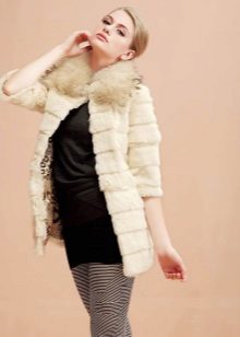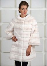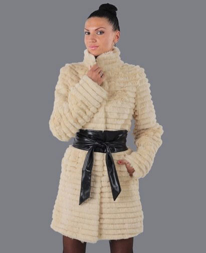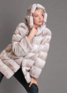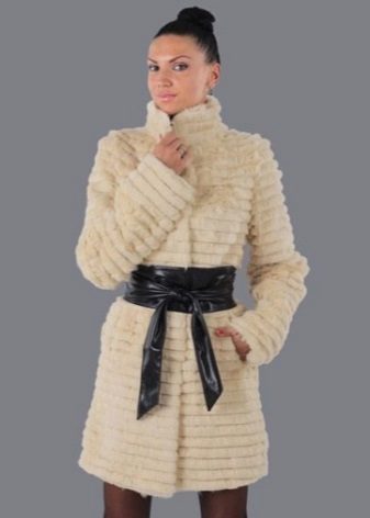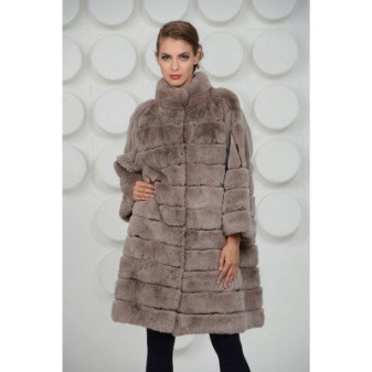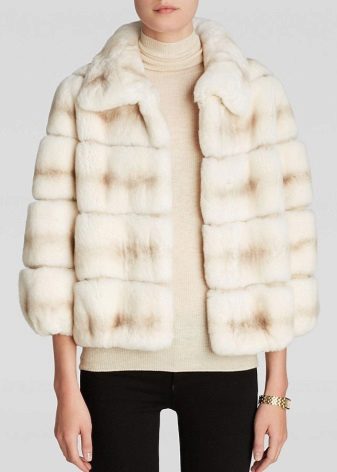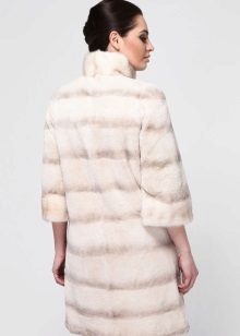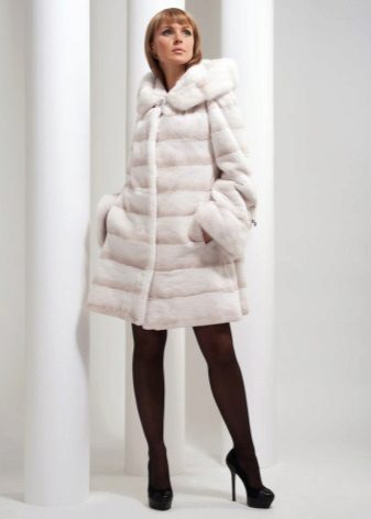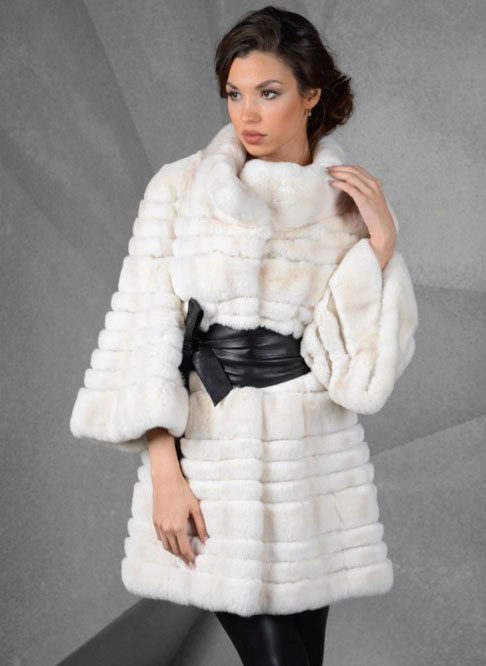 A fur coat transverse of a rabbit is sewn from fur strips arranged horizontally. Fashion designers can enhance the effect of strip separation by clipping them. Such a product made of snow-white rabbit fur looks especially attractive.