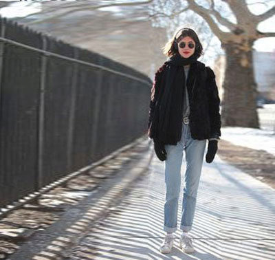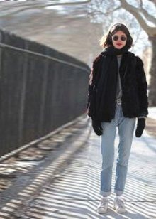 A sweater with a throat and a hat with a fur pompon will help to complement the youth look. It is better to buy a bag with short handles, so that there is no temptation to wear it on the shoulder, wearing down thin fur.