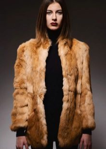 Lightweight rabbit jacket without a collar is sewn from solid pieces of red fur. Such a minimalist design coat not only looks elegant, but does not hinder movement when driving.