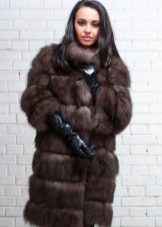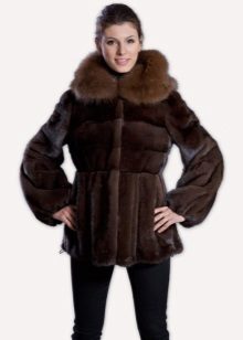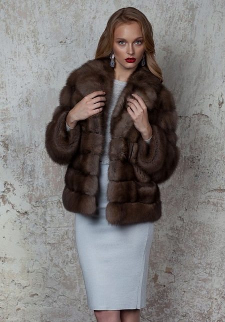 - Fluffy transverse fur coat shortened style, to the middle of the buttocks, made of marten fur brown and equipped with a hood - cobra. The product, although it has a short length, but, nevertheless, will be perfectly combined not only with trouser outfits.