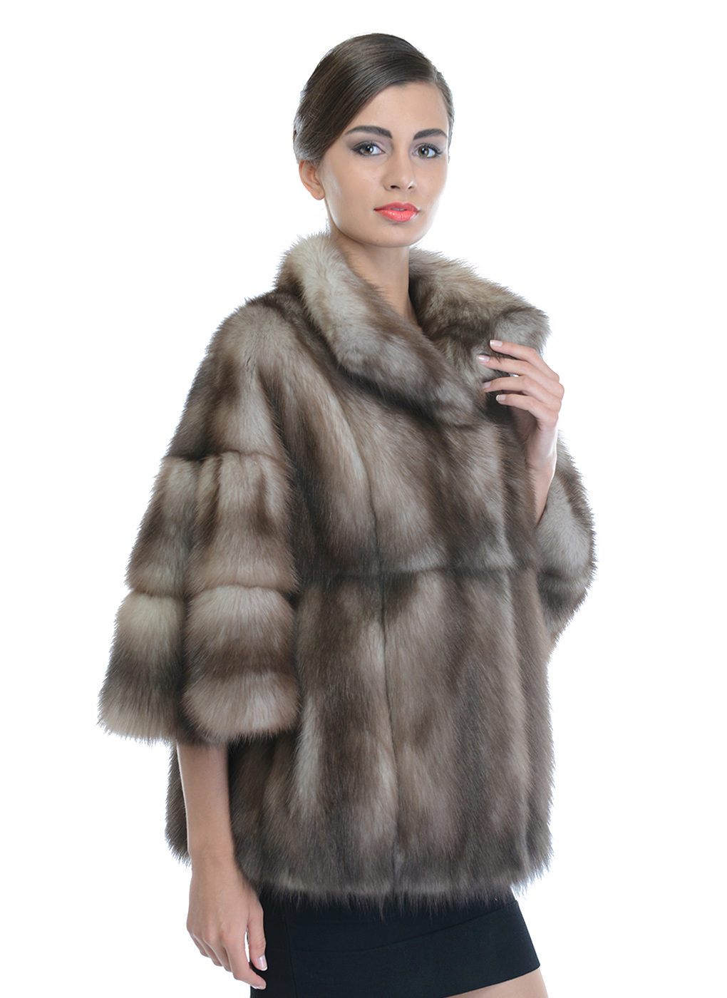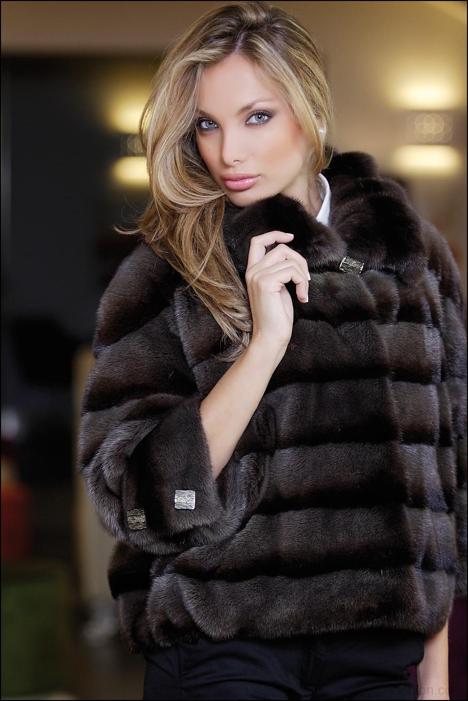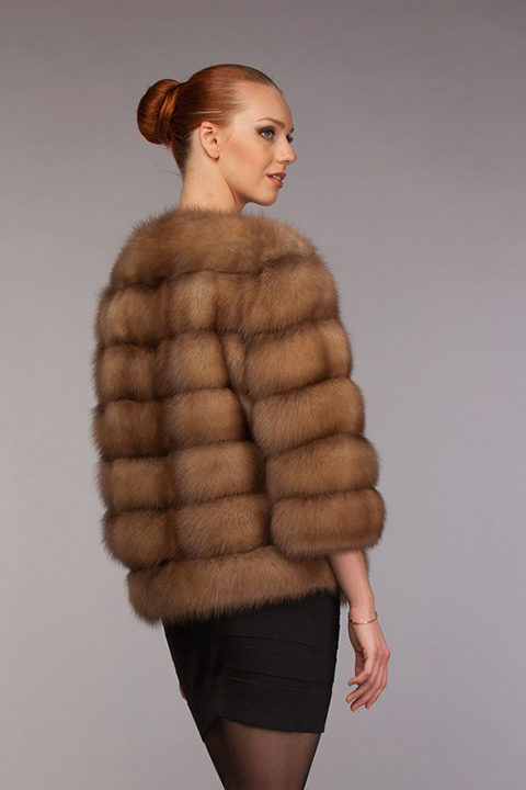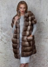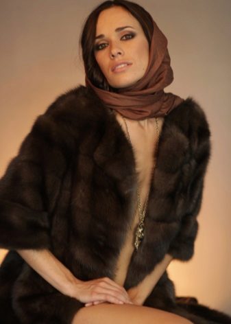The length of the product only closes the buttocks, and the sleeves are shortened - 3/4, but, nevertheless, the fur coat looks great with evening dresses on the floor in a straight cut.