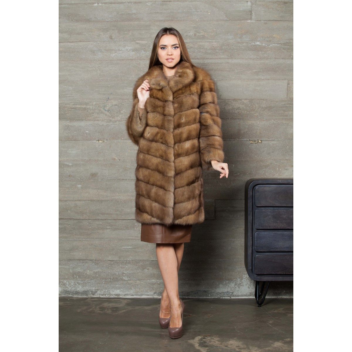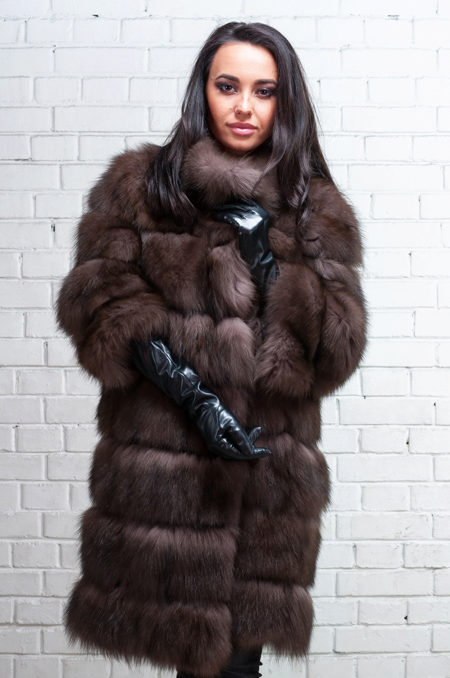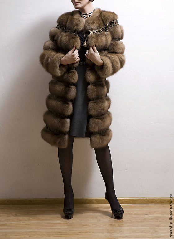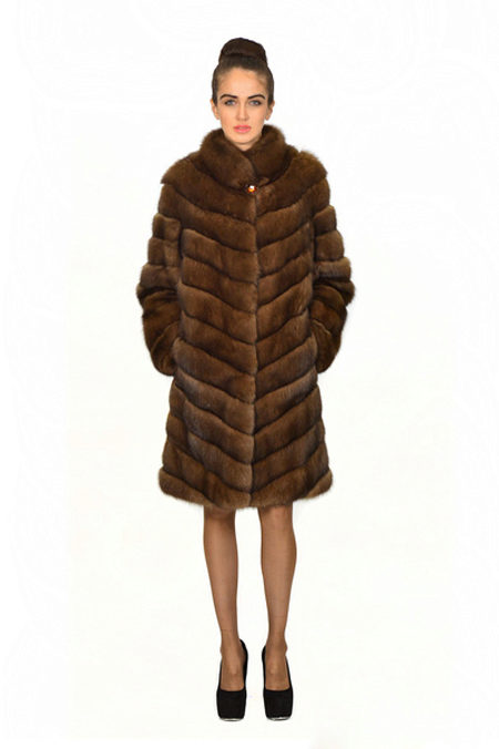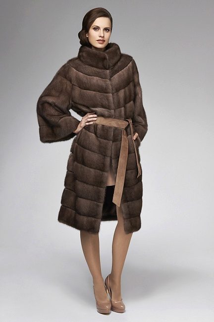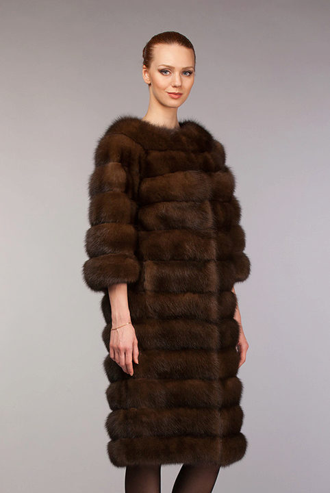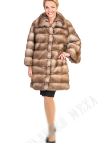- Another model of fur coat from marten fur, above the knee length with a standard sleeve, is also equipped with a hood - a cobra and looks truly gorgeous. The coat has a rather warm, unusual shade - milk chocolate, which makes it visually delicate and light.
