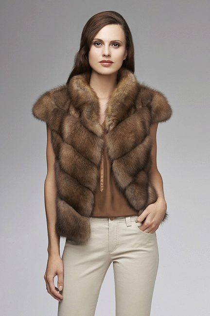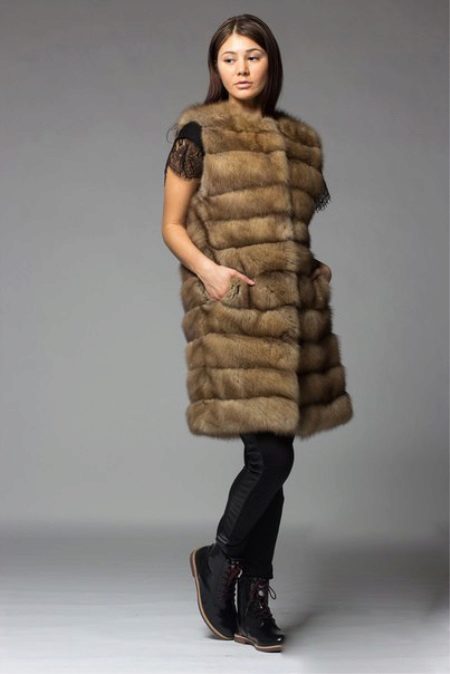 - To create an interesting, stylish image, you may need non-standard details, which, although they look beautiful, are not always functional. One of such products is a fur sleeveless jacket in a light brown color, which goes well with skinny trousers of dark shades, as well as jackets of various models.