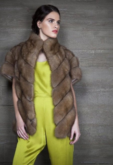 - Stylish, but completely non-functional cappuccino coat, has a short sleeve and a length that covers the buttocks. And since the product is decorative, it will be perfectly combined with many other unusual things. The bright satin overalls of a salad shade will perfectly fit into any image with this model of a fur coat.