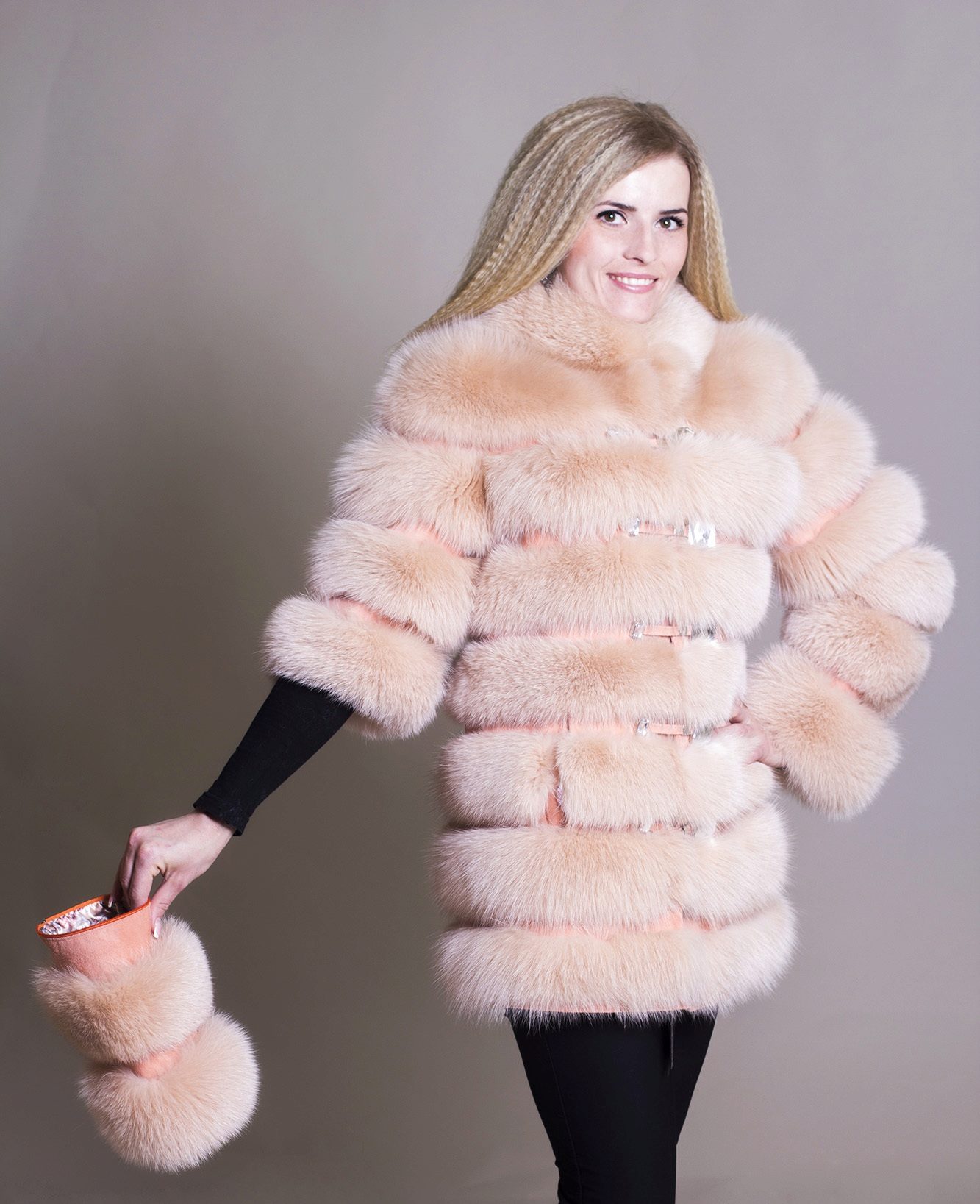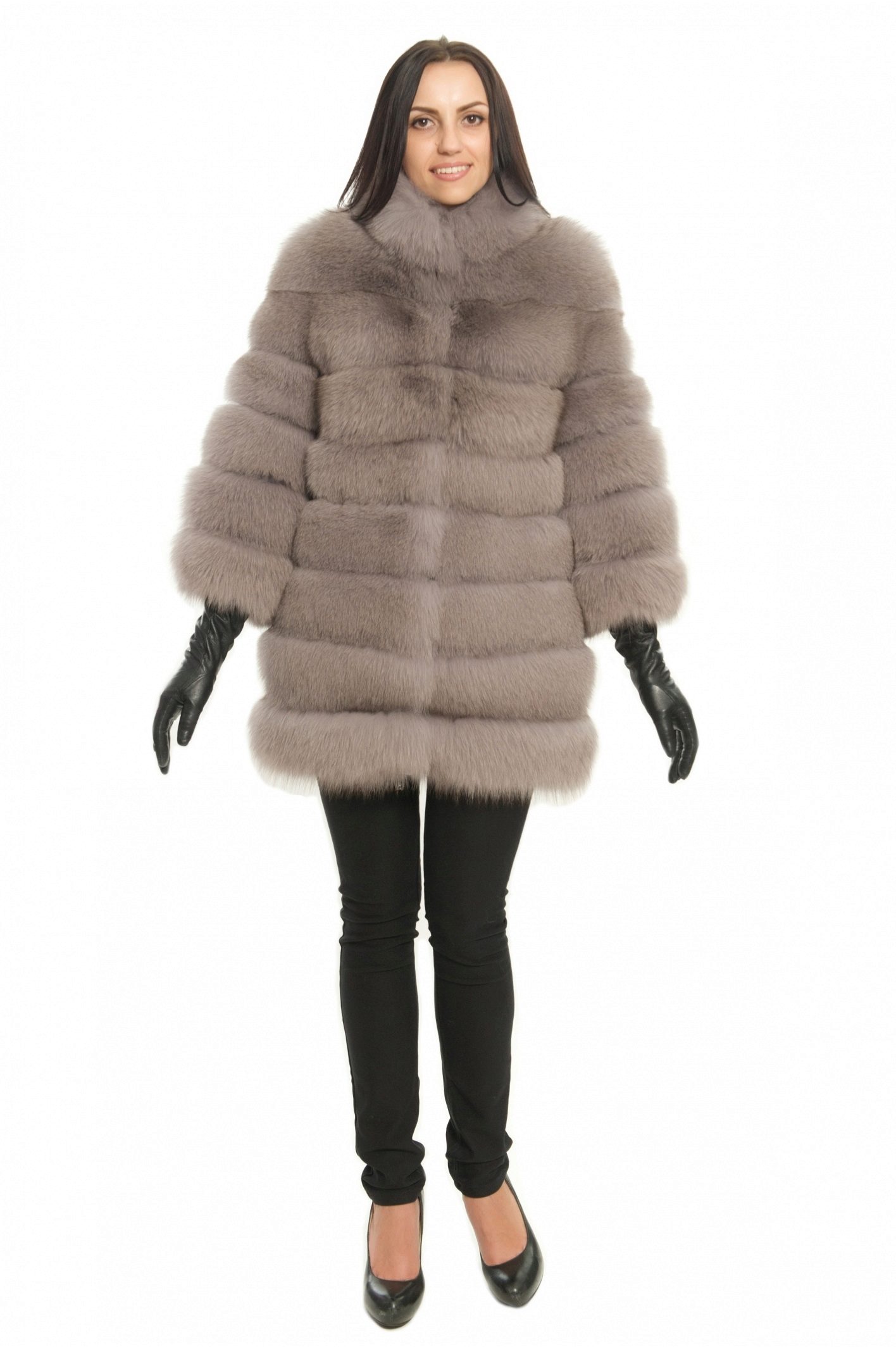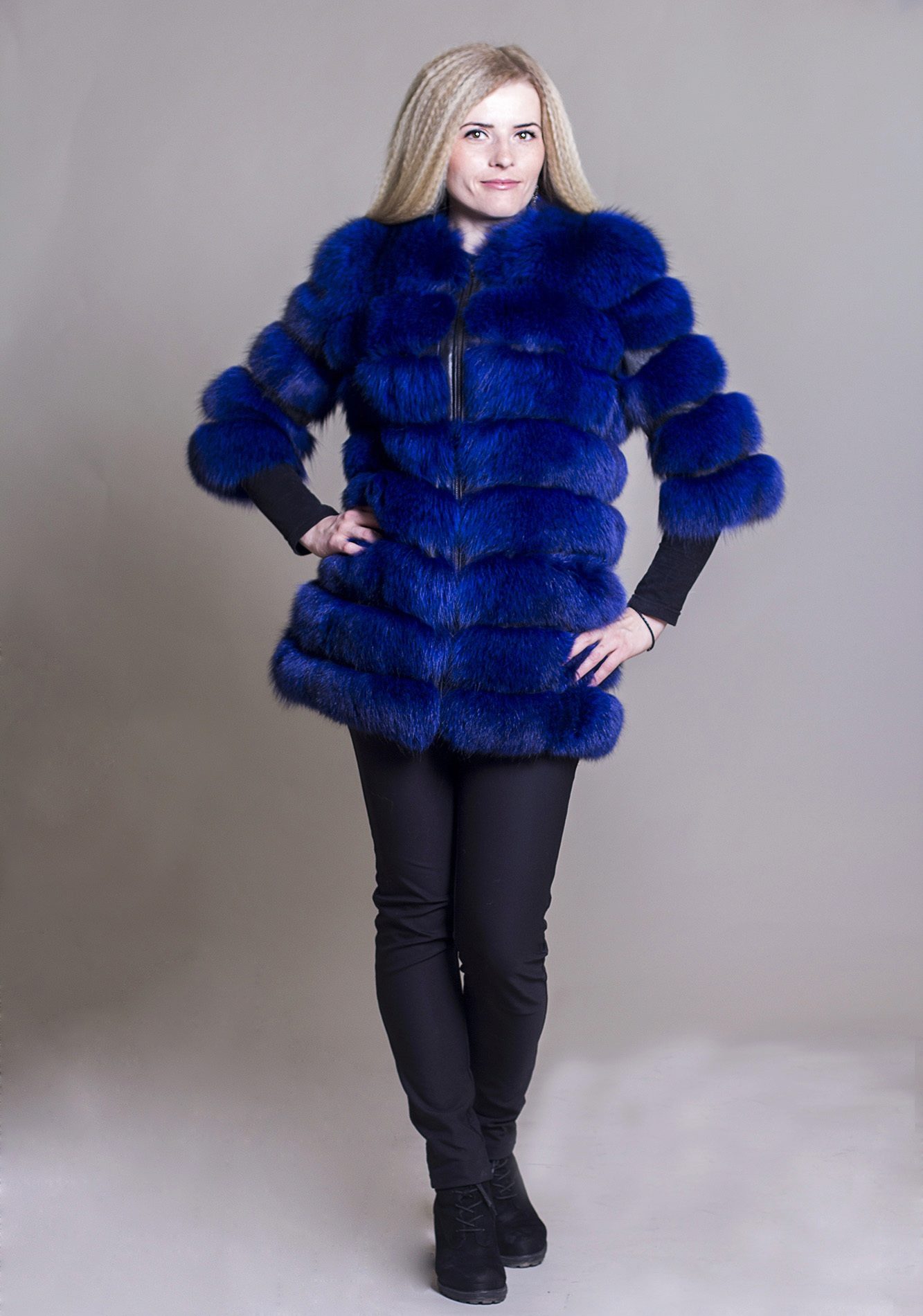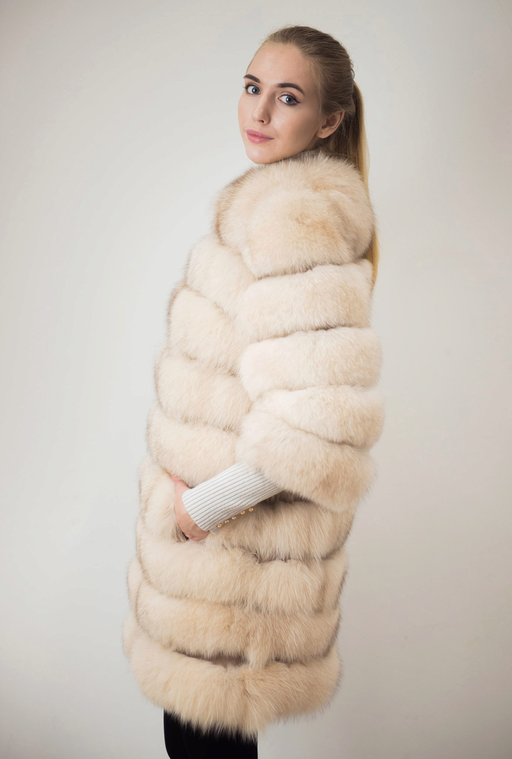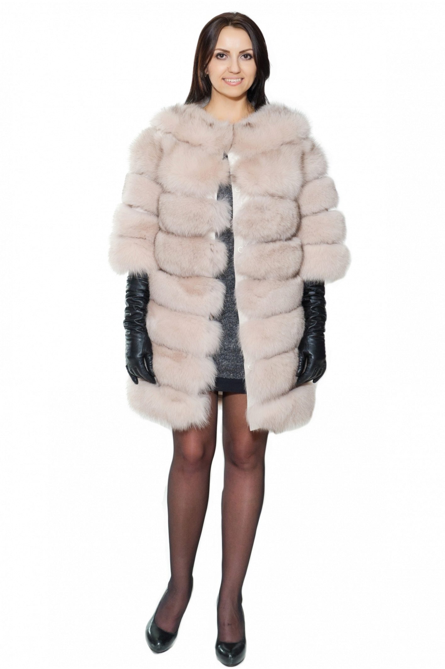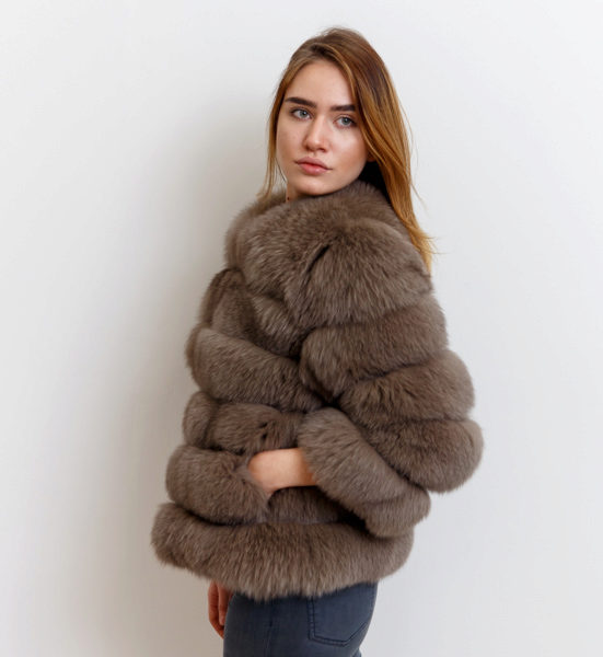 - A very practical fox coat of platinum color.