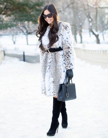 Putting on such an extraordinary thing as a fur coat of lynx fur, you need to carefully choose accessories. After all, such a bright model harmoniously looks only with certain, calm, colors of clothes, best of all monophonic.