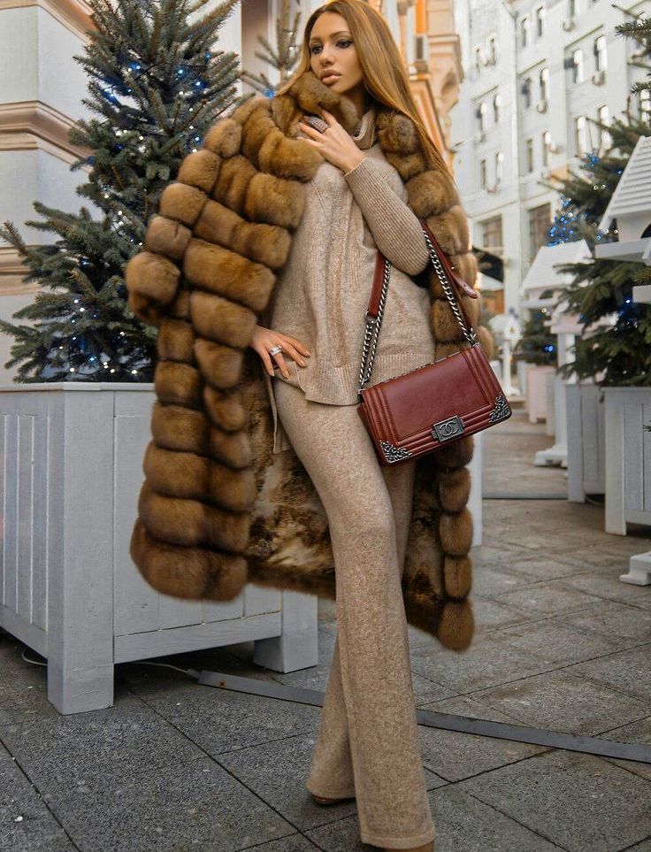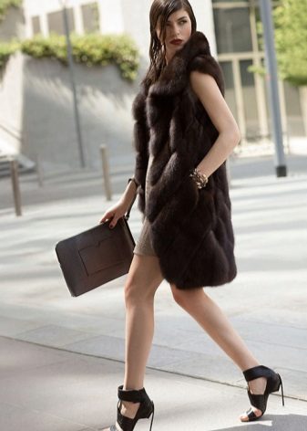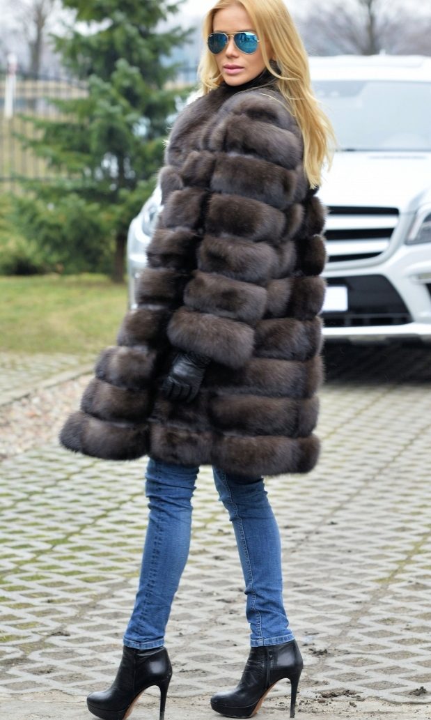 The most feminine and beautiful way will be a combination of a sable fur coat with a dress. An elegant cross-cut fur coat will perfectly decorate a silk bow to match the fur product, and a light dress will accentuate the beauty and shine of sable fur.