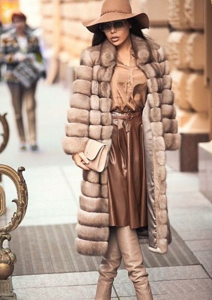 Brown goes well with dark green. And the next image is confirmation. The marsh overalls of medium length go well with a natural sable fur coat. Leather boots with a thick heel in the tone of outerwear give the image of completeness.