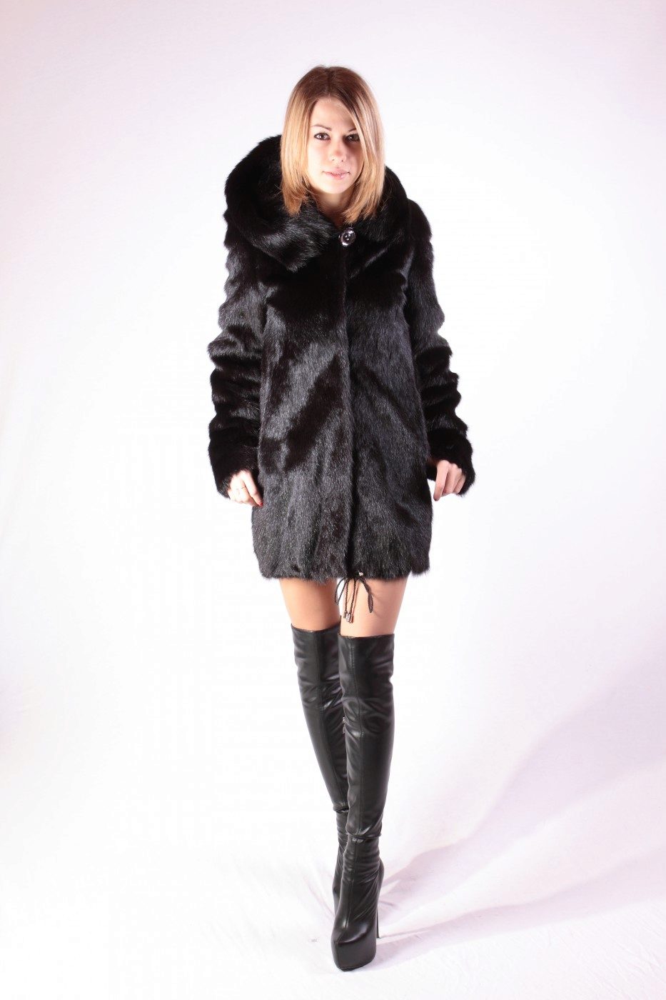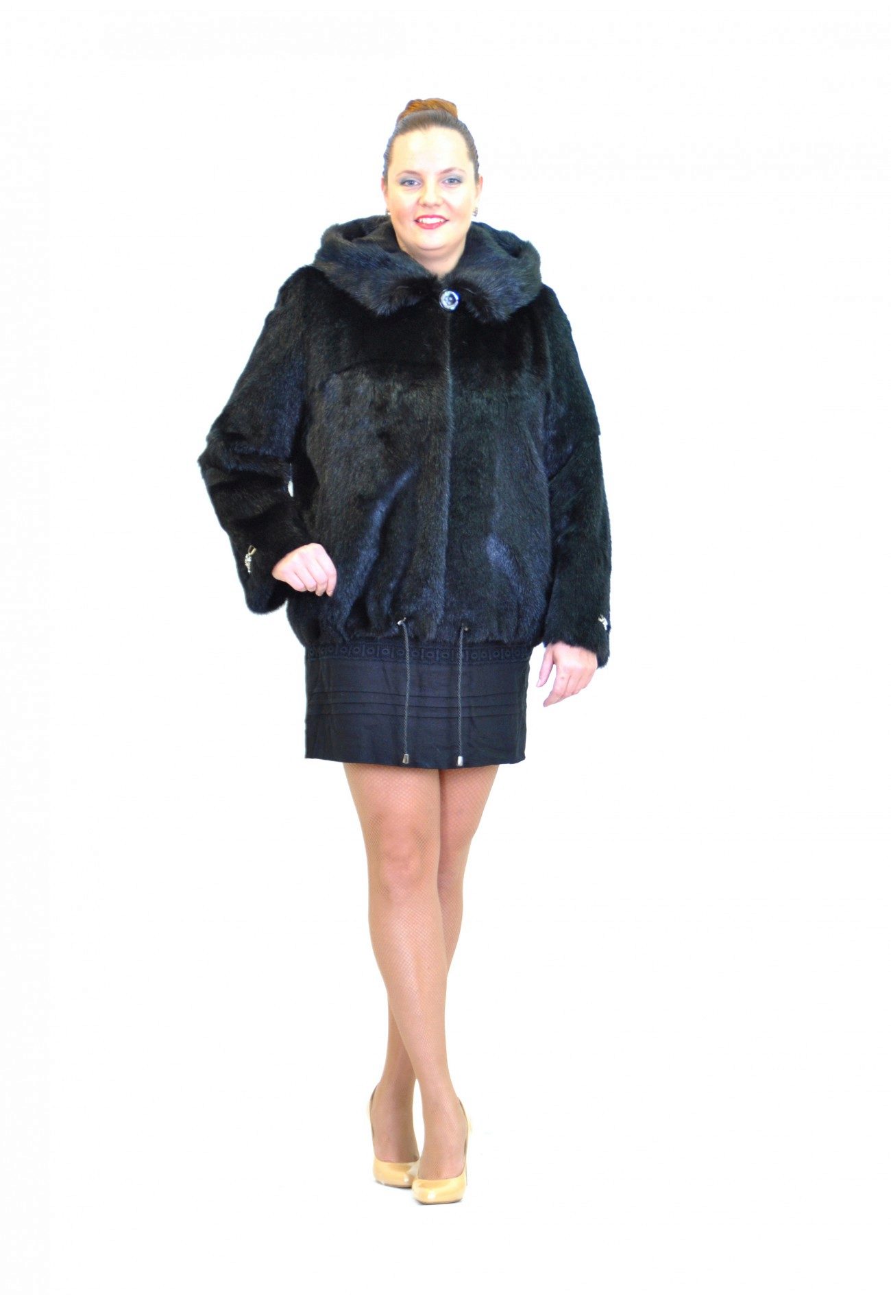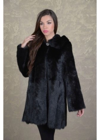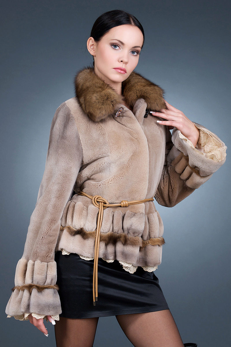 The original short fur coat of tinted woodchuck will attract the attention of young girls and avtoledi. This unusual product is complemented with a full-fledged hood and is decorated at the top with a large shiny button.