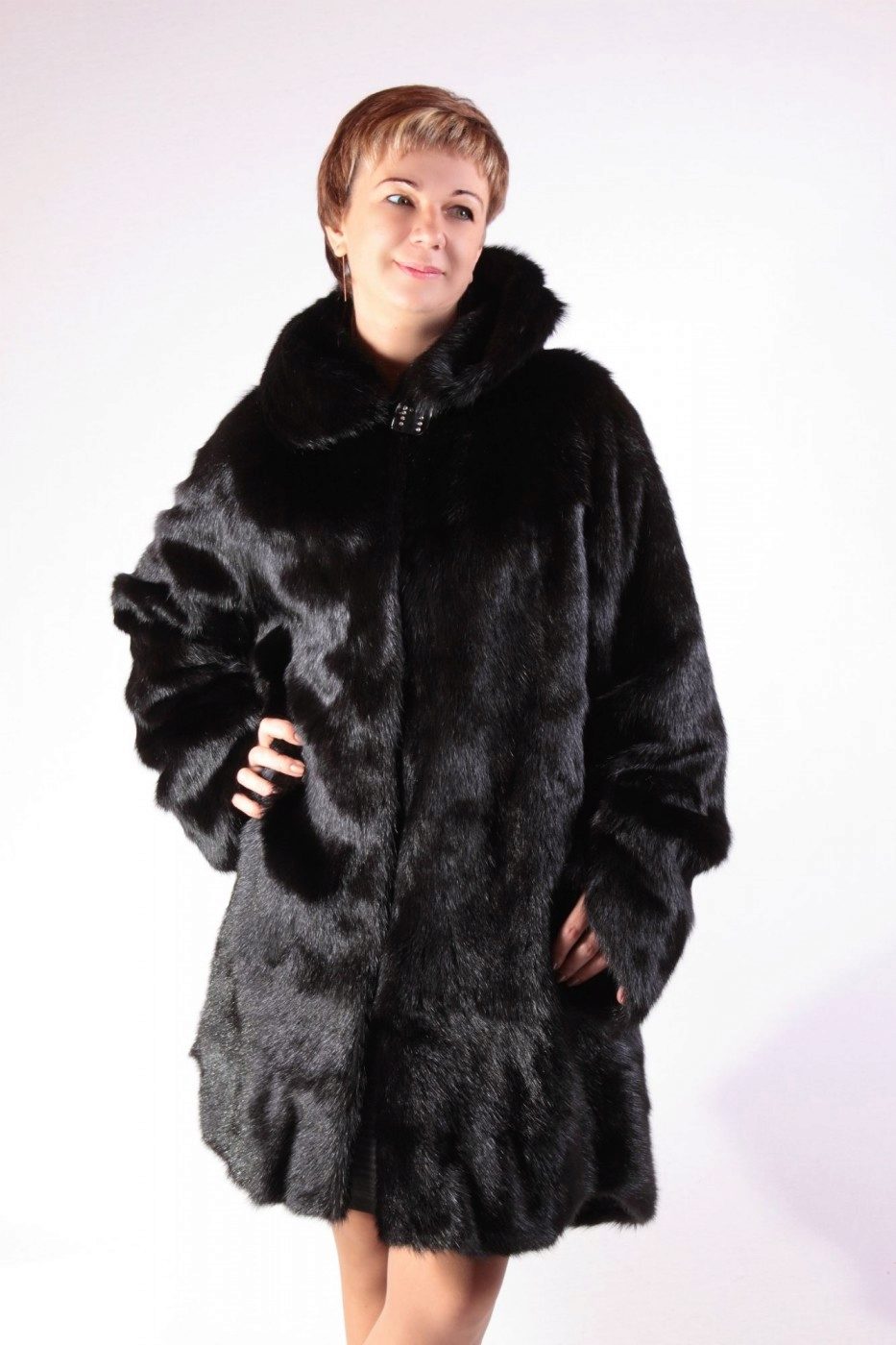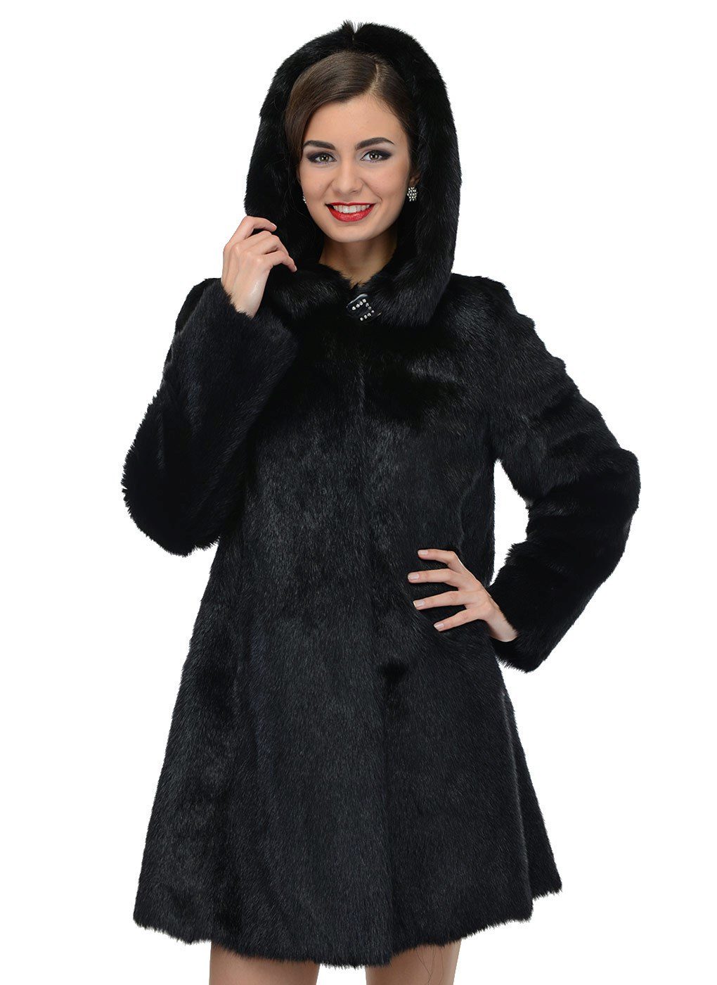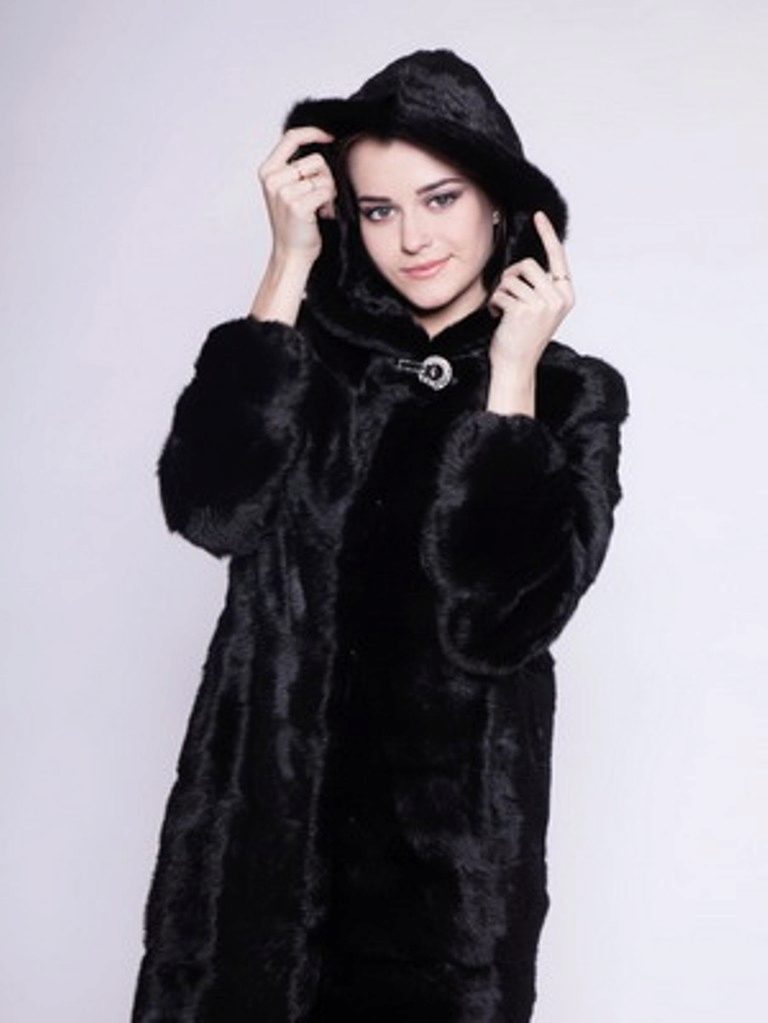 The classic straight style coat of woodchuck attracts an exquisite chestnut hue. The wide hood can be used for its intended purpose, and it can be left lying on its shoulders, straightening like a shawl. If desired, such a fur coat can be worn with a fur belt, emphasizing the waist.