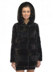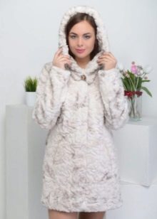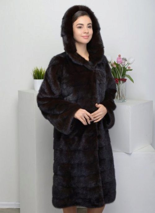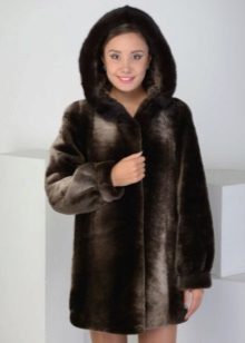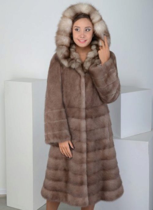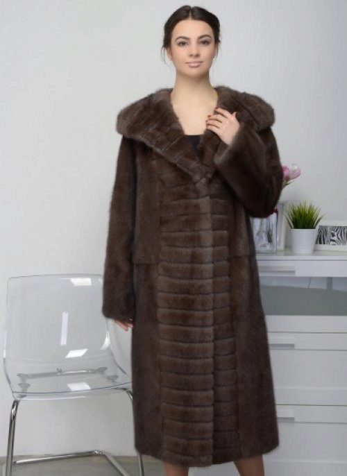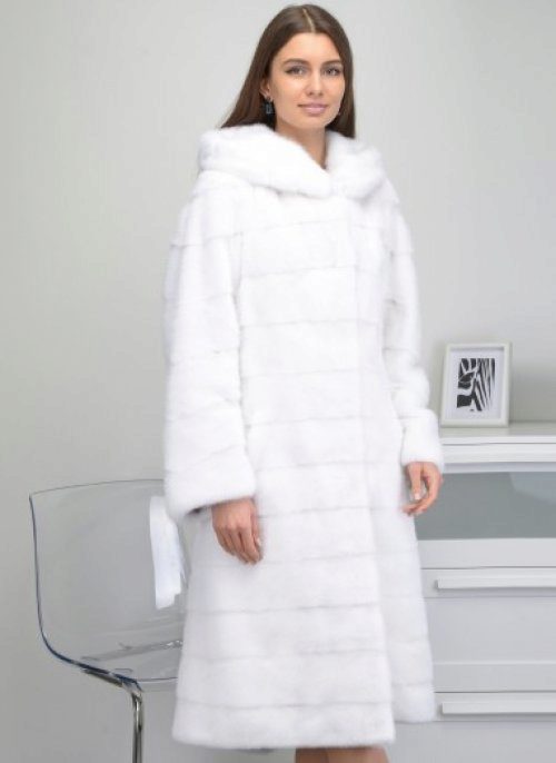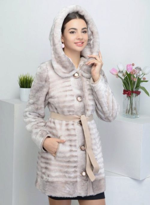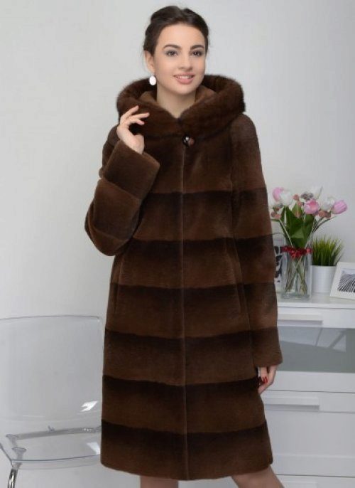 - Shakira - feminine style of an elongated fur coat made of cross strips of mink fur, is presented in the catalog of the Kalyaev factory in several colors: white, walnut and pastel. A special feature is the classic hood of the same material;