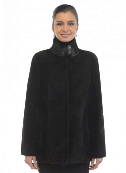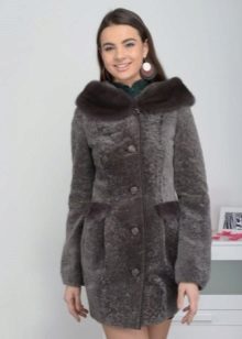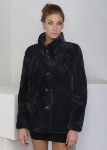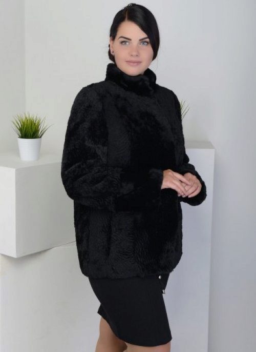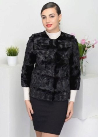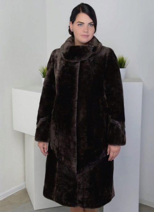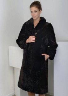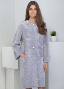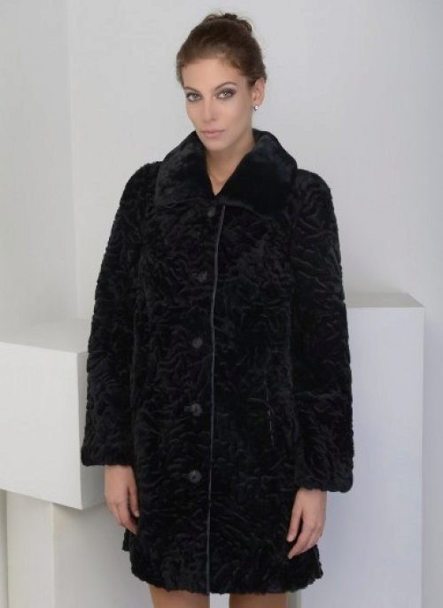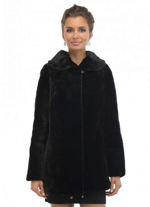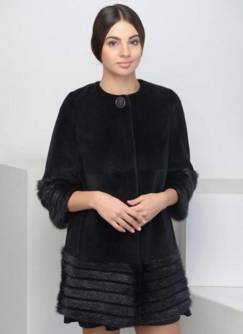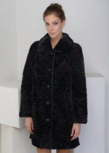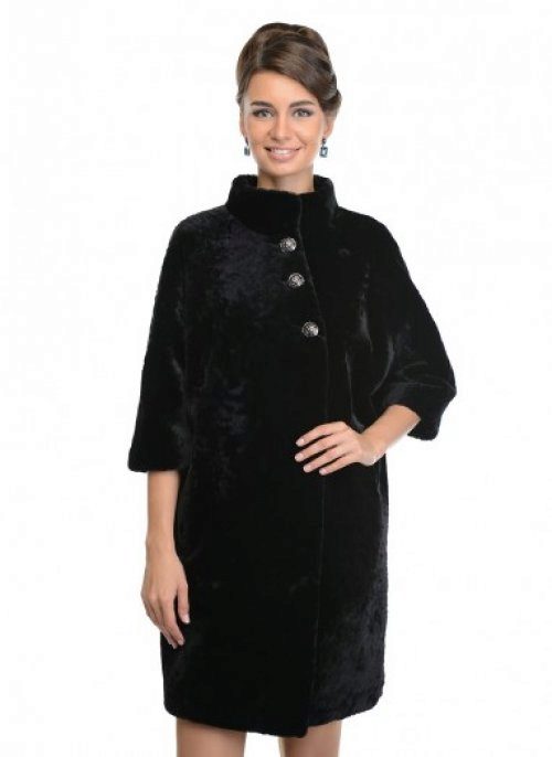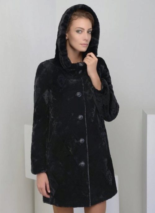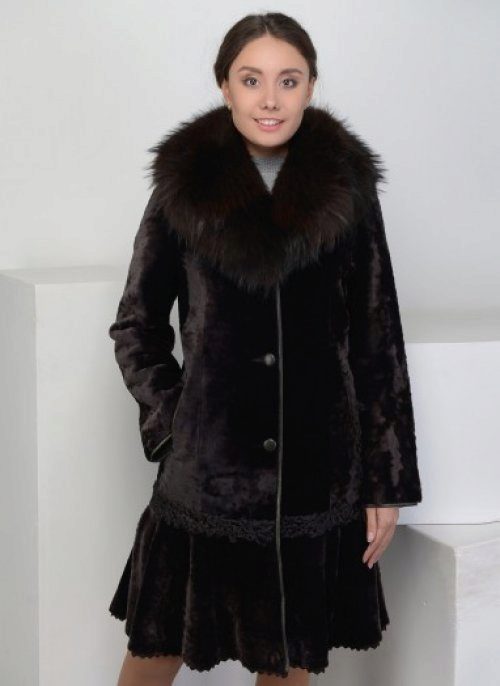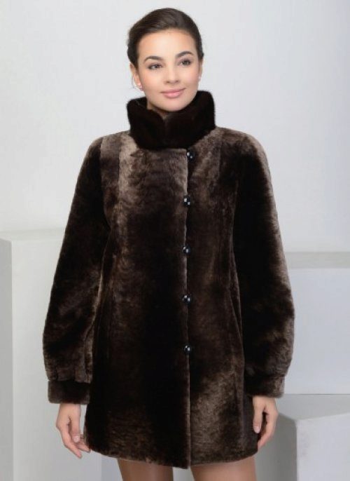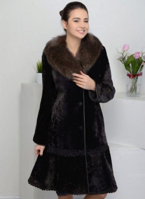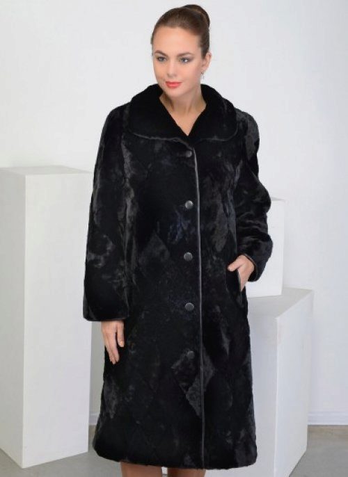 The most delicate image of a young girl, created thanks to the velvety structure of astragan. The color of baked milk and decorative inserts imitating pockets add extra elegance. Buttons to match are not distracting attention, performing a practical function. Such a fur coat of the Kalyaev factory will suit young lovers of feminine dresses, as well as modern avtoledi.