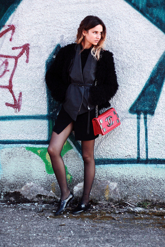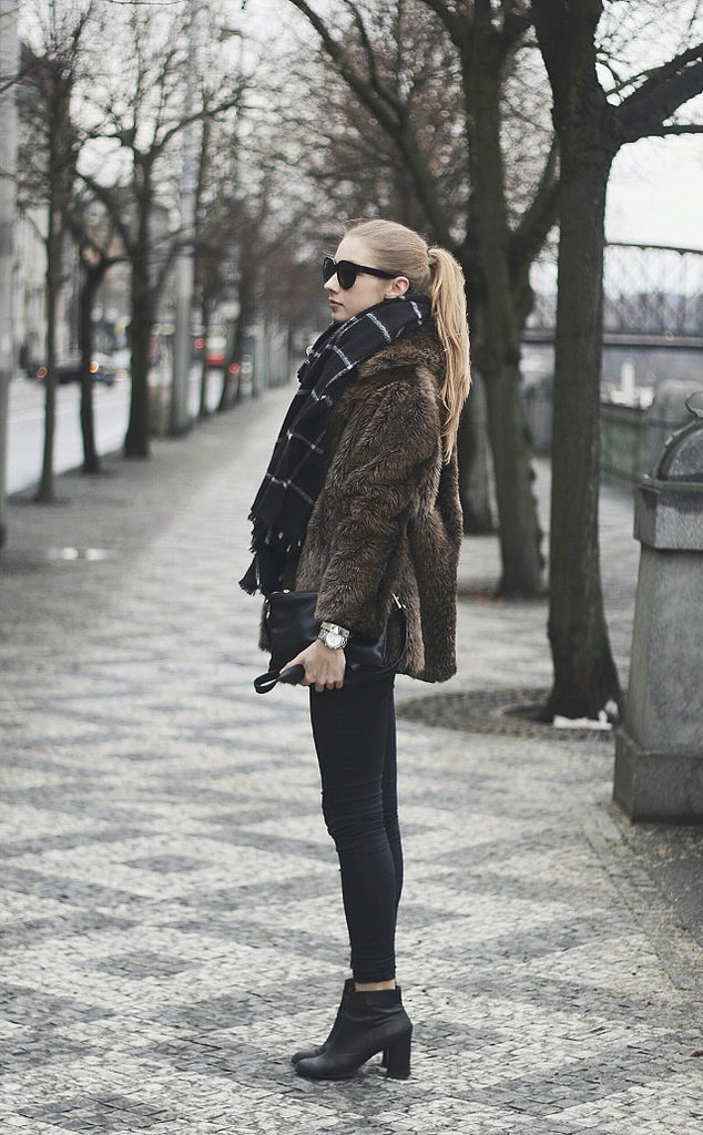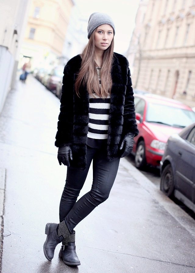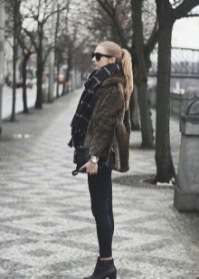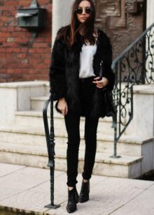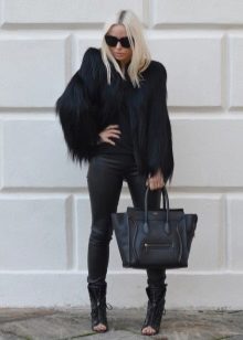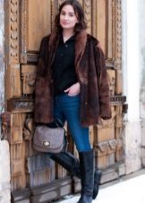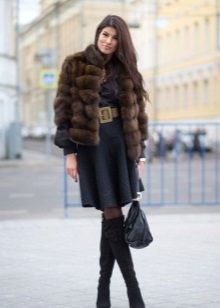 The classic option, where there is nothing superfluous. Black mink coat with a transverse arrangement of the skins is successfully combined with a short pencil skirt and ankle boots with high heels.
