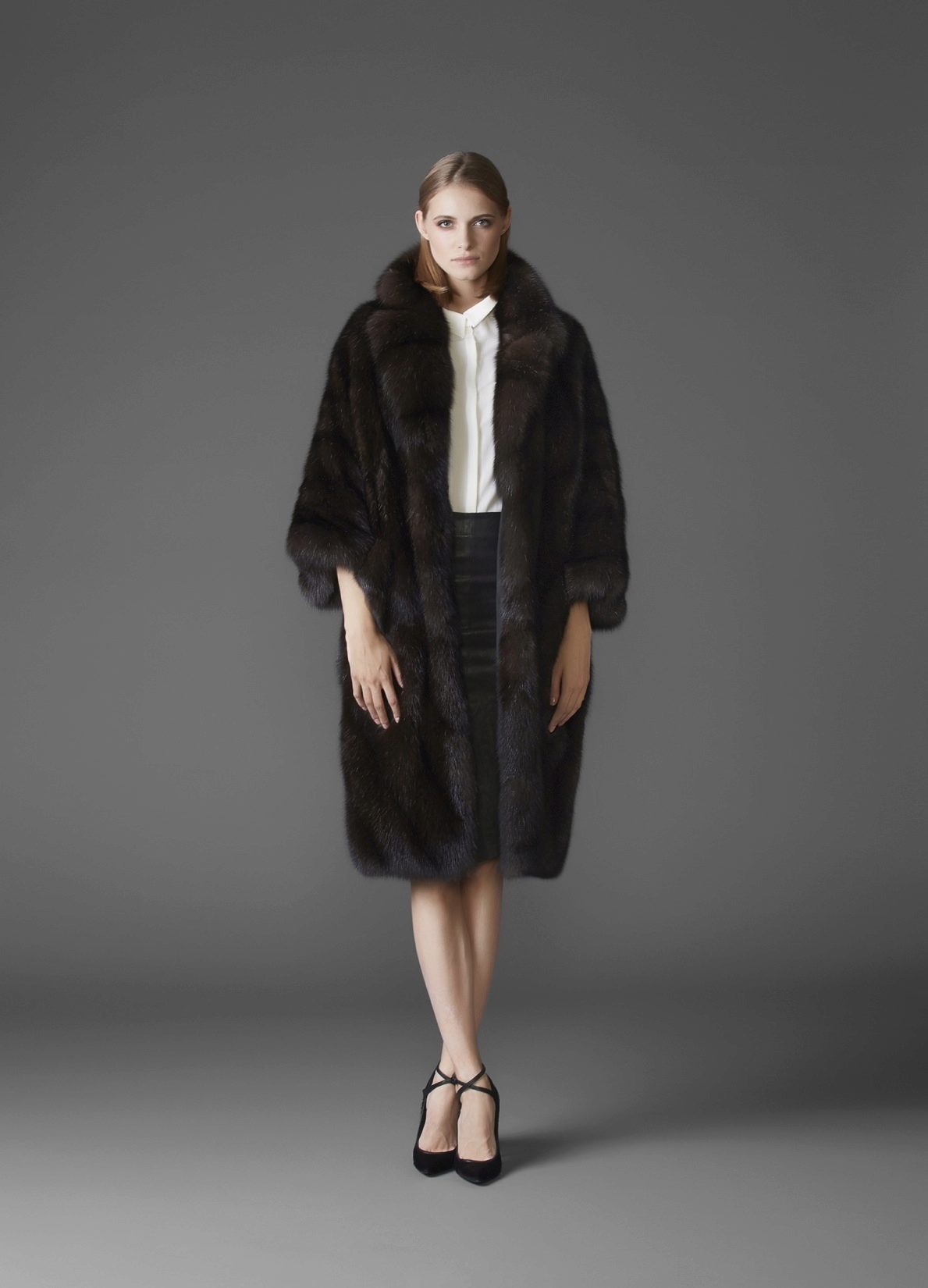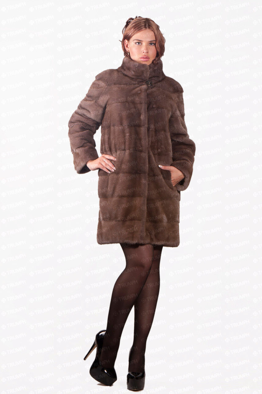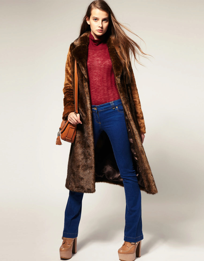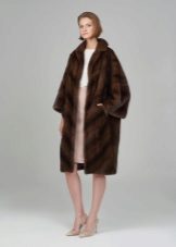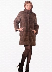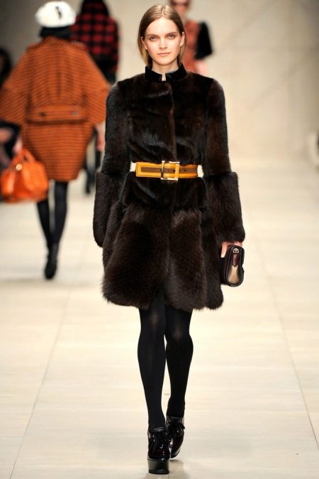 A spectacular brown fur coat just above the knee and with an interesting stand-up collar is perfect for a young lady. To create a more interesting image, it can be supplemented with a bright yellow belt.