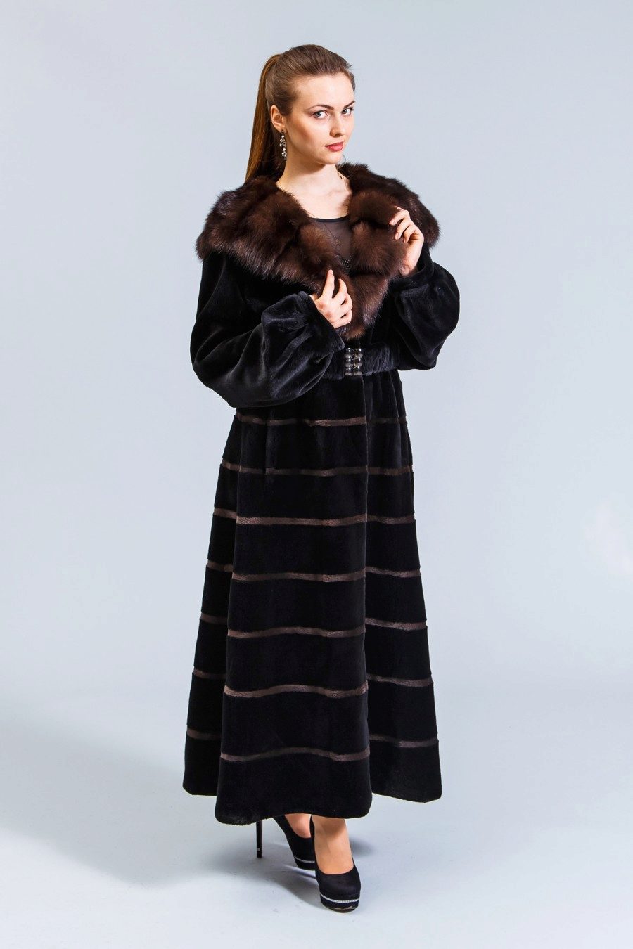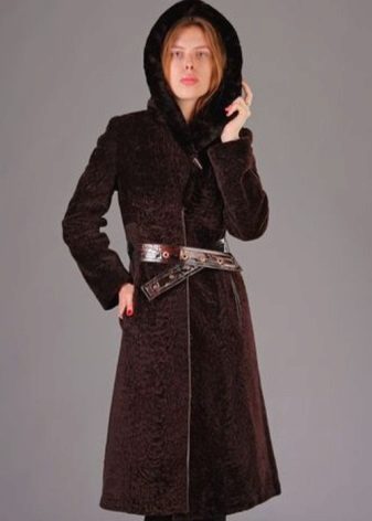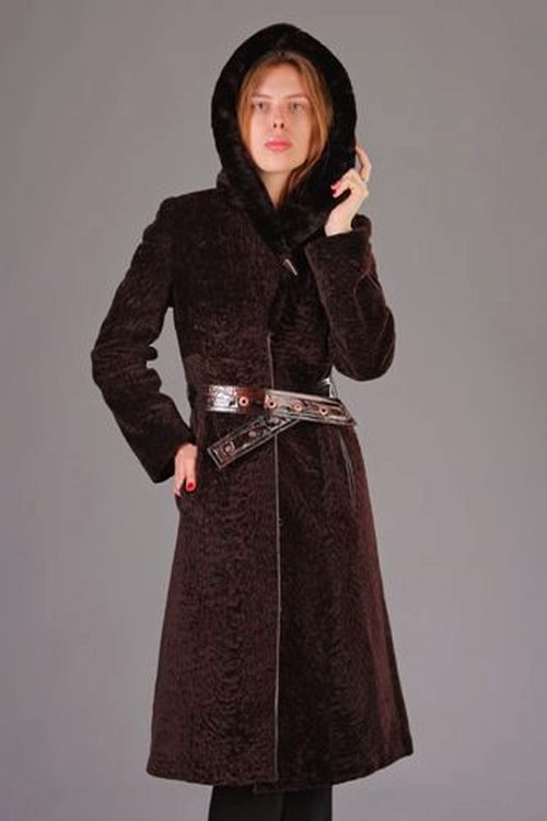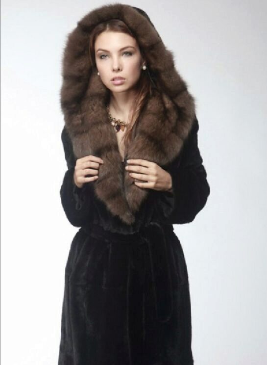 An elongated brown fur coat is the best way to warm in the most severe frosts. It protects from cold and wind, giving warmth and comfort to its owner.