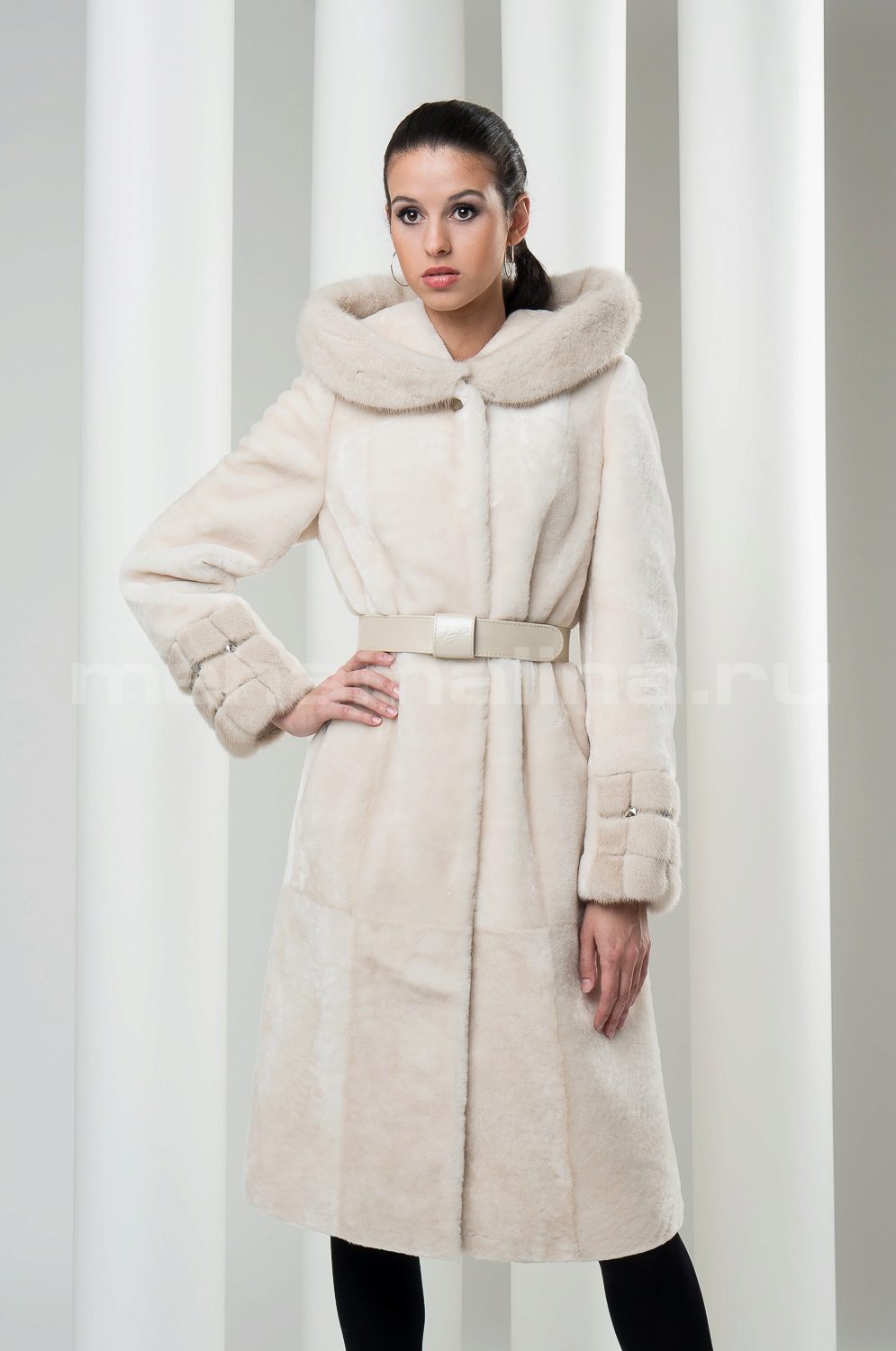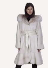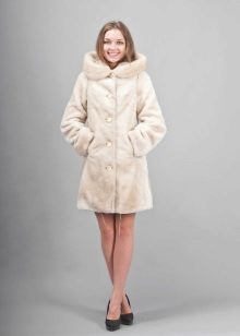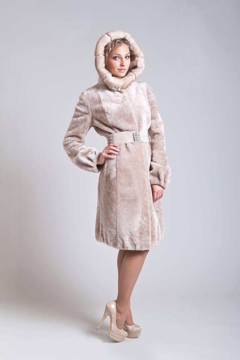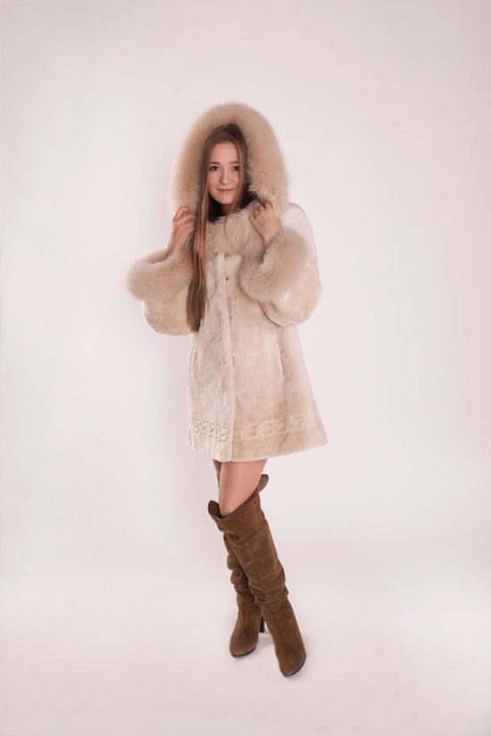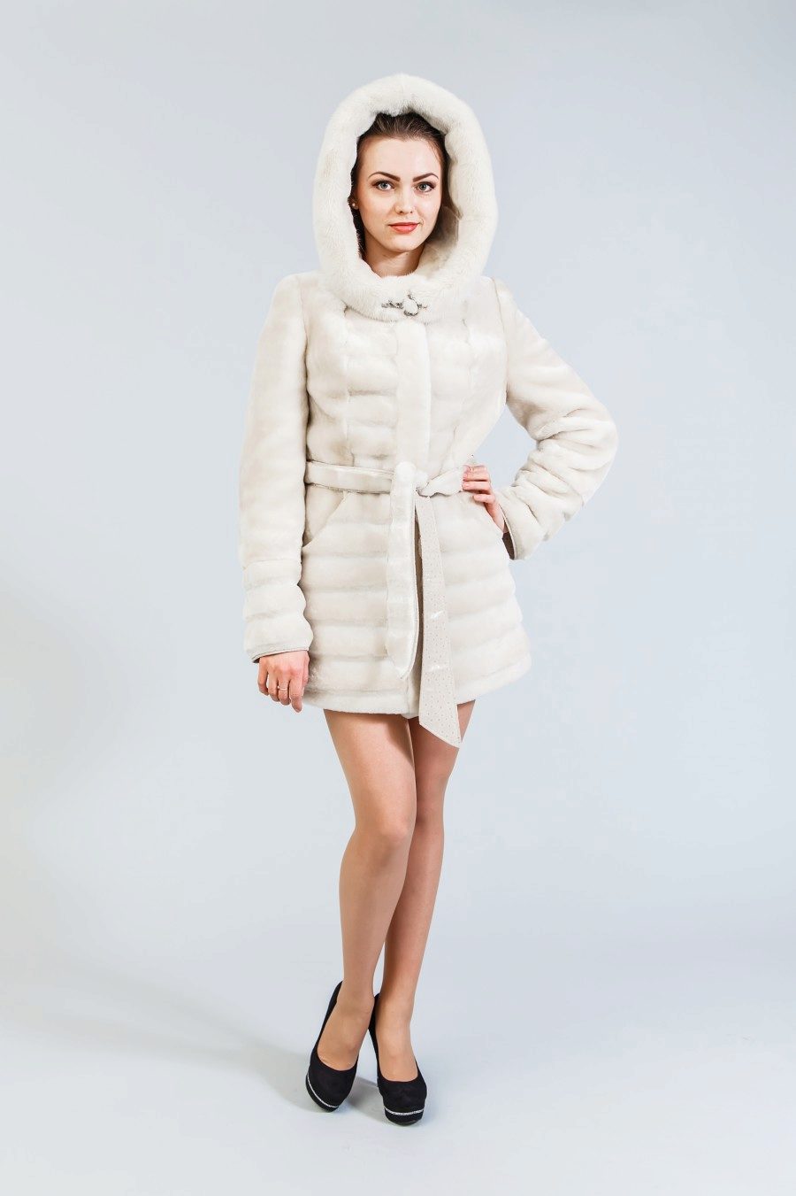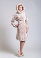 Pearl-colored fur coat with a hood and cuffs trimmed with mink, another example of good taste, based on the absence of unnecessary details. The non-detachable edging of the hood, the trimming of the cuffs with rectangles and the belt with a leather buckle do not catch the eye, but they give the product the very high cost that mink trimming should give.