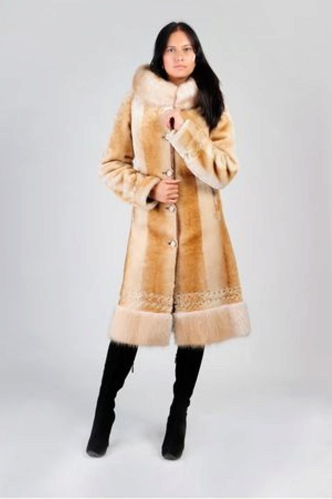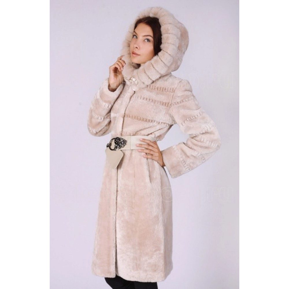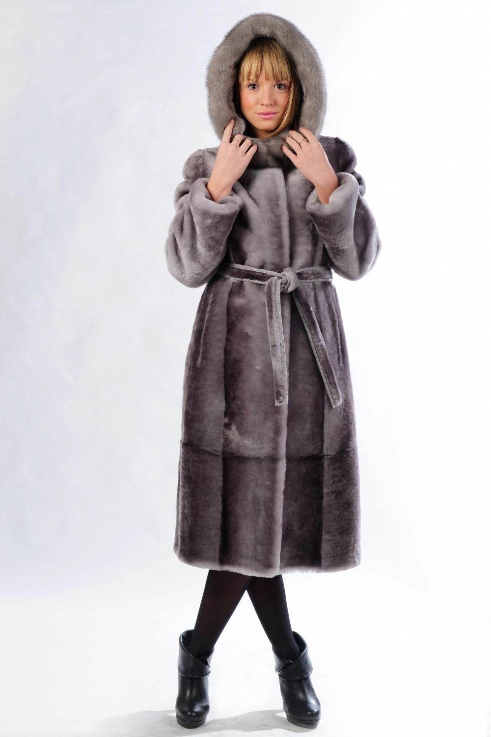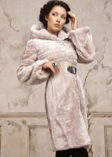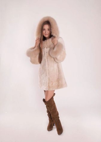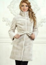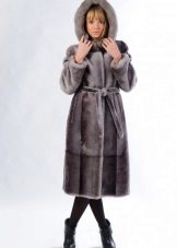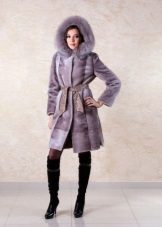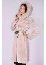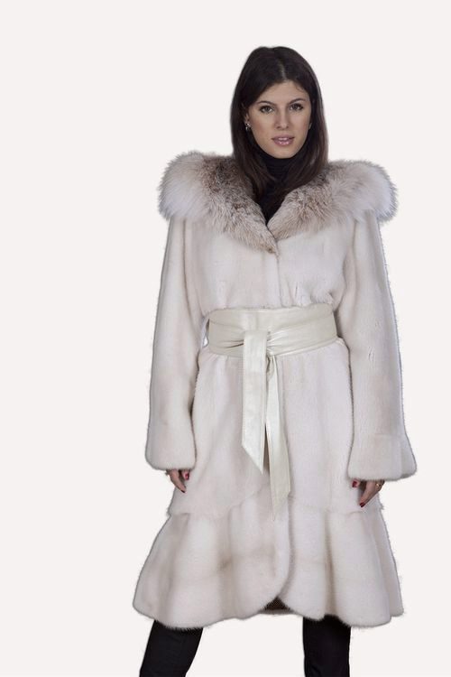 Pearl-colored fur coat with a hood and cuffs trimmed with mink, another example of good taste, based on the absence of unnecessary details. The non-detachable edging of the hood, the trimming of the cuffs with rectangles and the belt with a leather buckle do not catch the eye, but they give the product the very high cost that mink trimming should give.