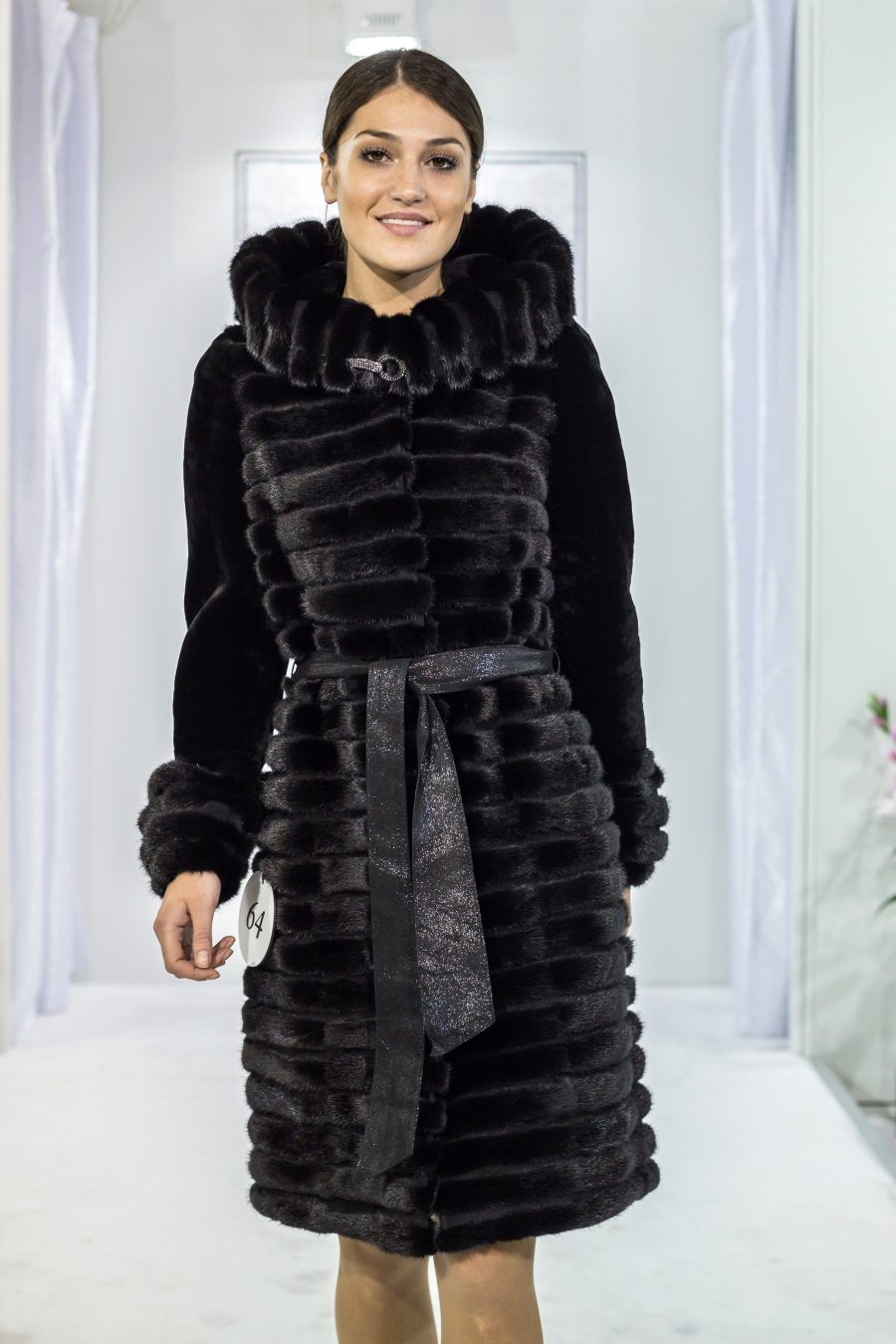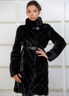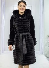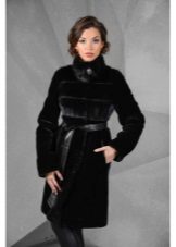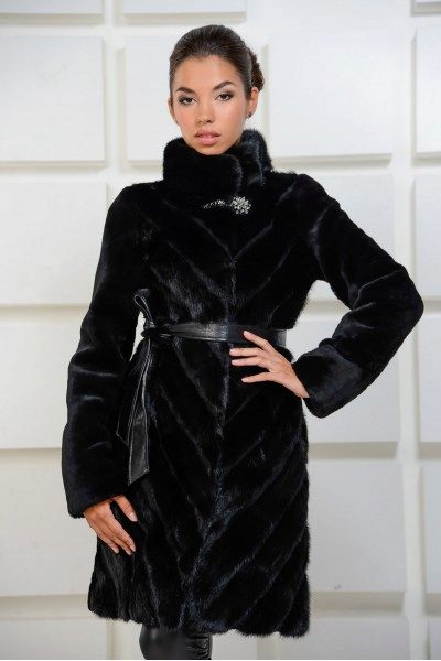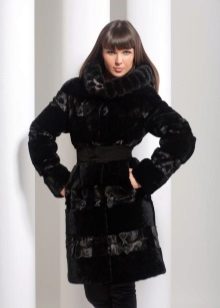 The fur coat of classic straight cut for a belt with a fashionable horizontal assembly of strips of different widths looks not only relevant, but also original. A stand-up collar, trimmed with mink, makes it look more luxurious.
