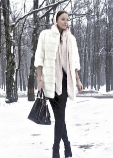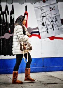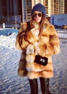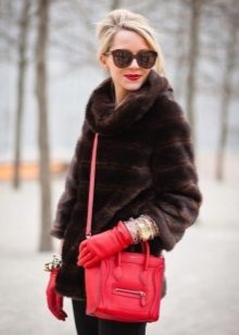 The average length of the model allows wearing both dresses and trousers under a fur coat. Shoes - another important nuance when building a wardrobe.The combination of a fur coat with a transverse cut with high-heeled boots and a high boot is always advantageous. Although more and more women today prefer not their elegance and chic, but their comfortable feeling. Therefore, it may be wedge shoes or a small but steady heel.