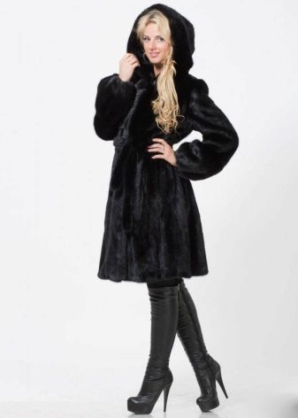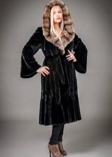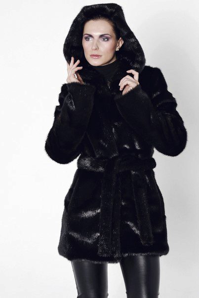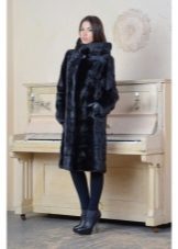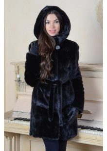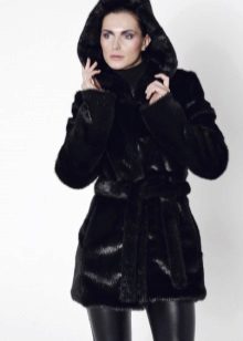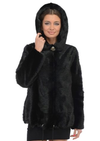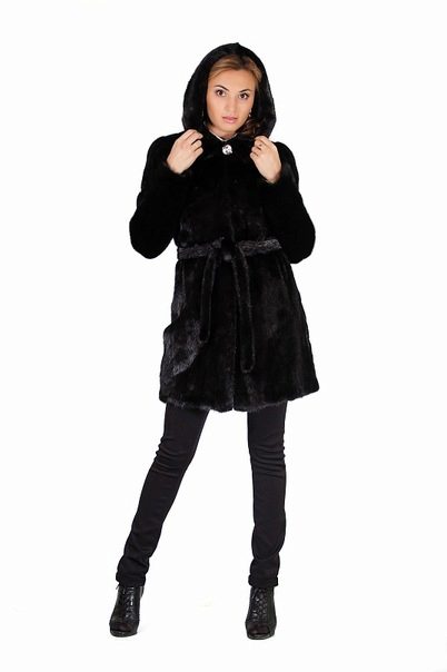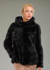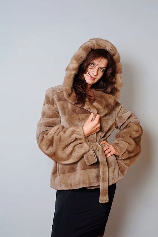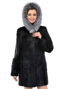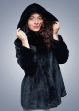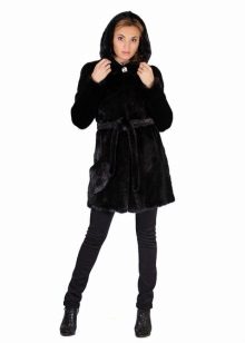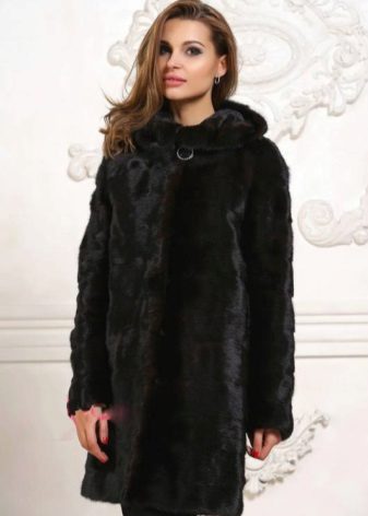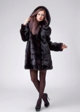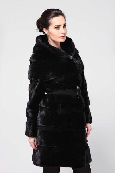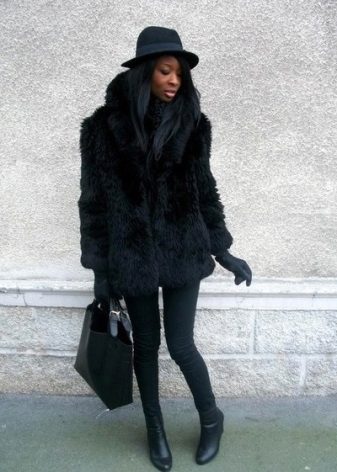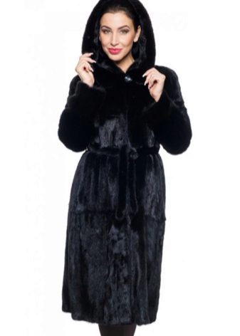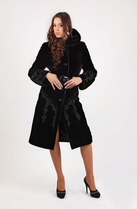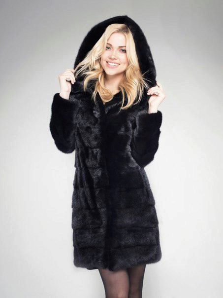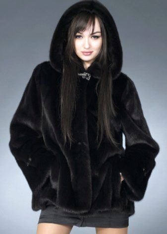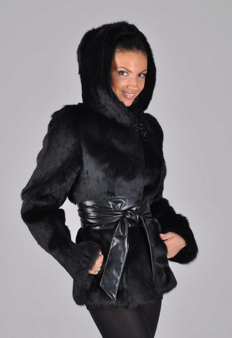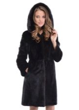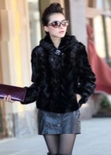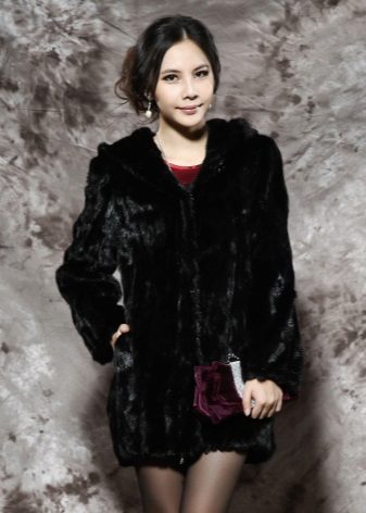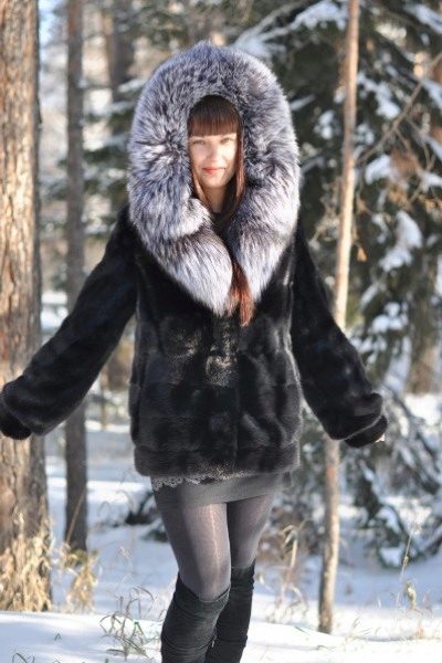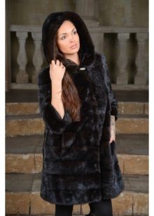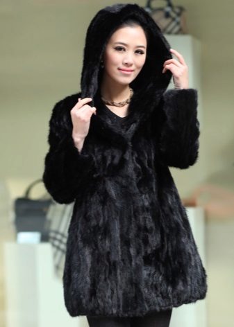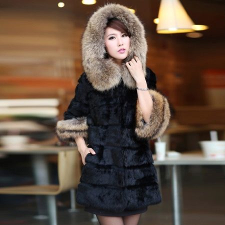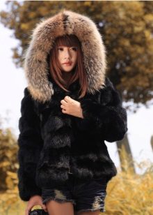 - The transverse black fur coat, in the style of Chanel, has a length that covers the buttocks, as well as shortened sleeves - 3/4. The cuffs of the sleeves, as well as the edge of the hood, have a palomino shade of fluffy fur, which gives the product a certain charm. In view of the special style of the sleeves, one should acquire warm elongated gloves. And in order not to freeze, we recommend combining this model with a trouser bottom or warm, tight tights. Since the fur coat has a luxurious elegant look, you should choose the model of shoes with heels.