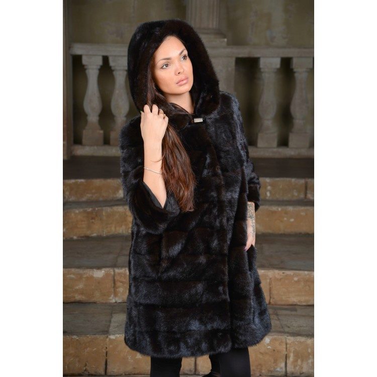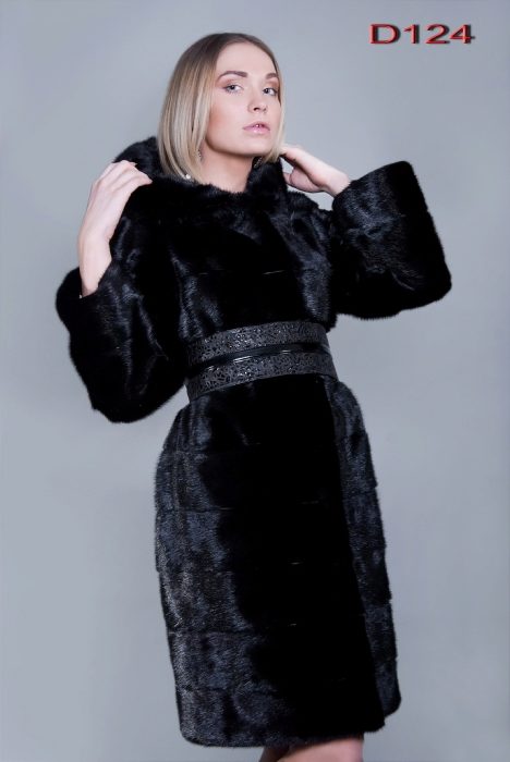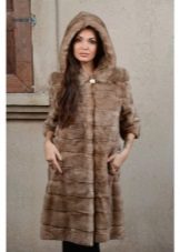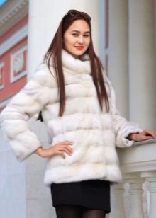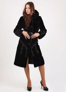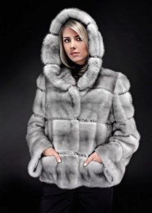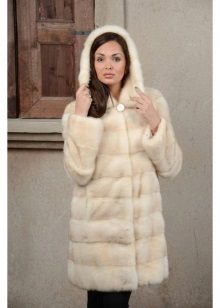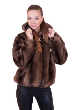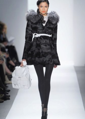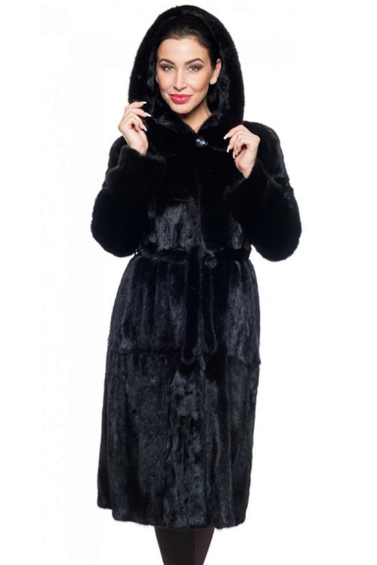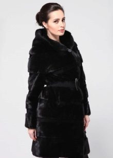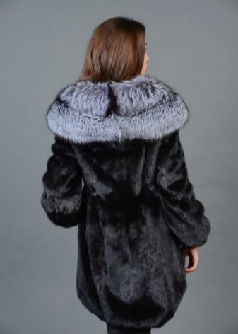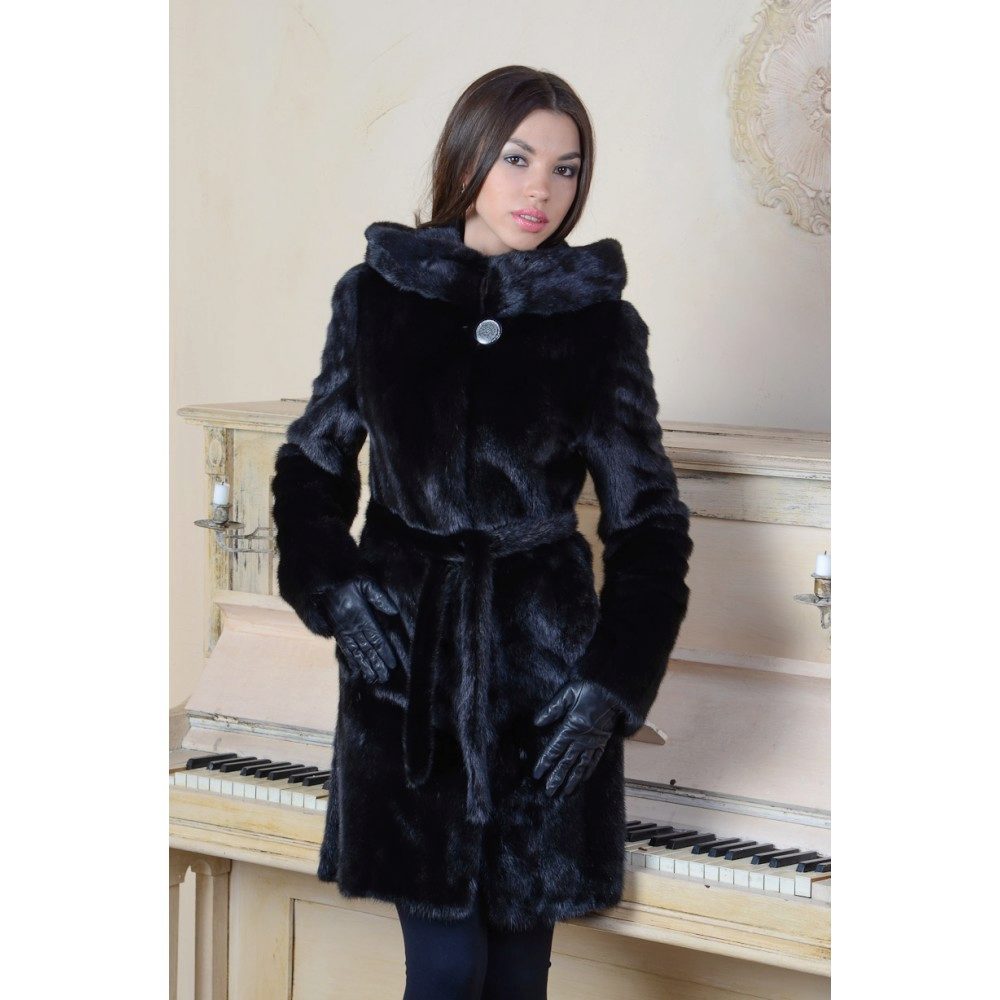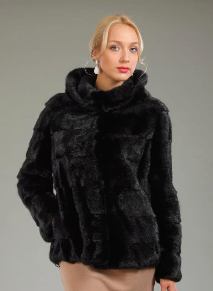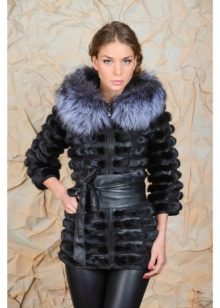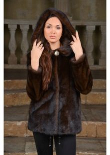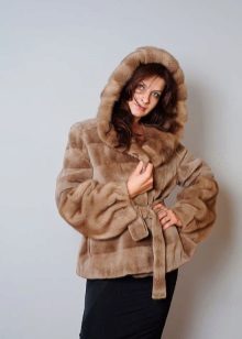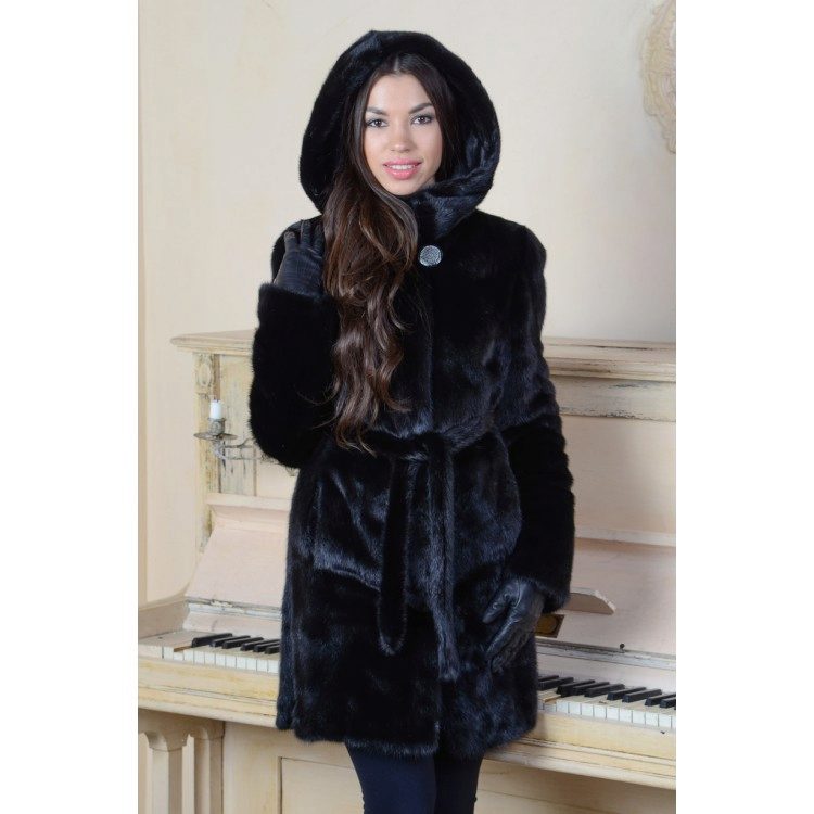 - The transverse black fur coat, in the style of Chanel, has a length that covers the buttocks, as well as shortened sleeves - 3/4. The cuffs of the sleeves, as well as the edge of the hood, have a palomino shade of fluffy fur, which gives the product a certain charm. In view of the special style of the sleeves, one should acquire warm elongated gloves. And in order not to freeze, we recommend combining this model with a trouser bottom or warm, tight tights. Since the fur coat has a luxurious elegant look, you should choose the model of shoes with heels.